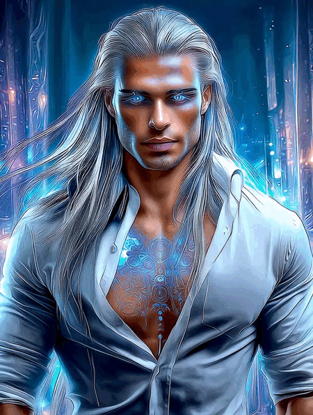 В глазах Аруноса вспыхивают неоновые огни. Его тело напрягается, зрачки расширяются, поглощая свет. На коже проступают голубые фрактальные узоры.