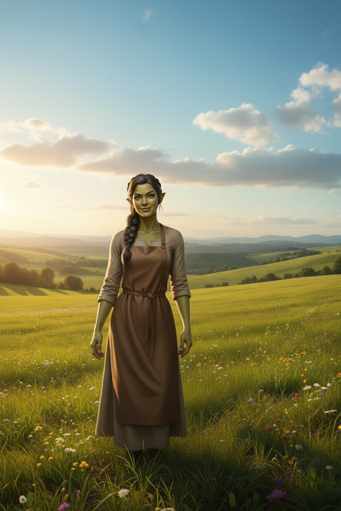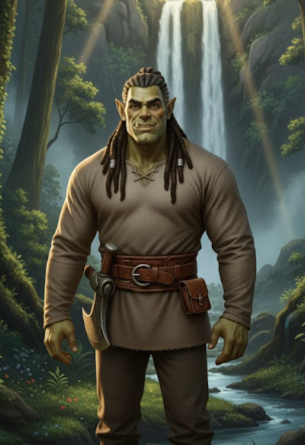 Он был огромен, под два метра ростом, с широкими, могучими плечами, которые казались высеченными из скалы. Его кожа была оливково-зелёного оттенка, а из-под тяжёлого, нахмуренного лба на неё смотрели пронзительно-умные карие глаза. Из нижней челюсти торчали два массивных клыка. Он был одет в простую, прочную кожаную одежду, а на поясе у него висел огромный, видавший виды топор. «Эстетика «убить-и-съесть». Очень вдохновляет».
