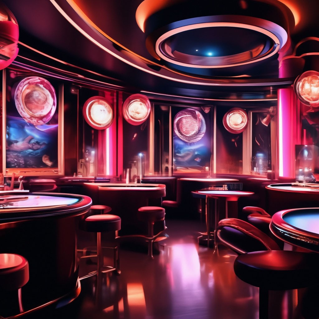 Интерьер выдержан в едином стиле. Никакой эклектики или безвкусицы. Насыщенные бордово-синие цвета. Столики, табуреты, сцена, оформление – все в виде круглых сфер. Просто, оригинально, ярко и со вкусом.