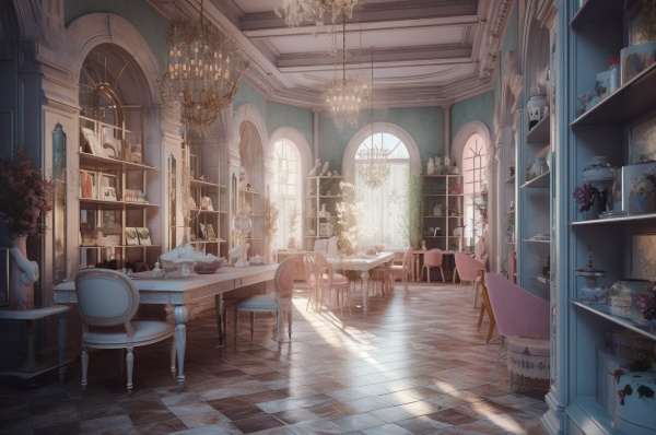 Романтичную атмосферу дополняли свисающие по углам зелёные растения и тут и там вазы со свежими цветами. От хрусталя люстр с потолка рассыпался по всей комнате белоснежный свет. От полукруглых длинных и широких окон – солнечные лучи мягкой дымкой добавляли ощущение чего-то сказочного.