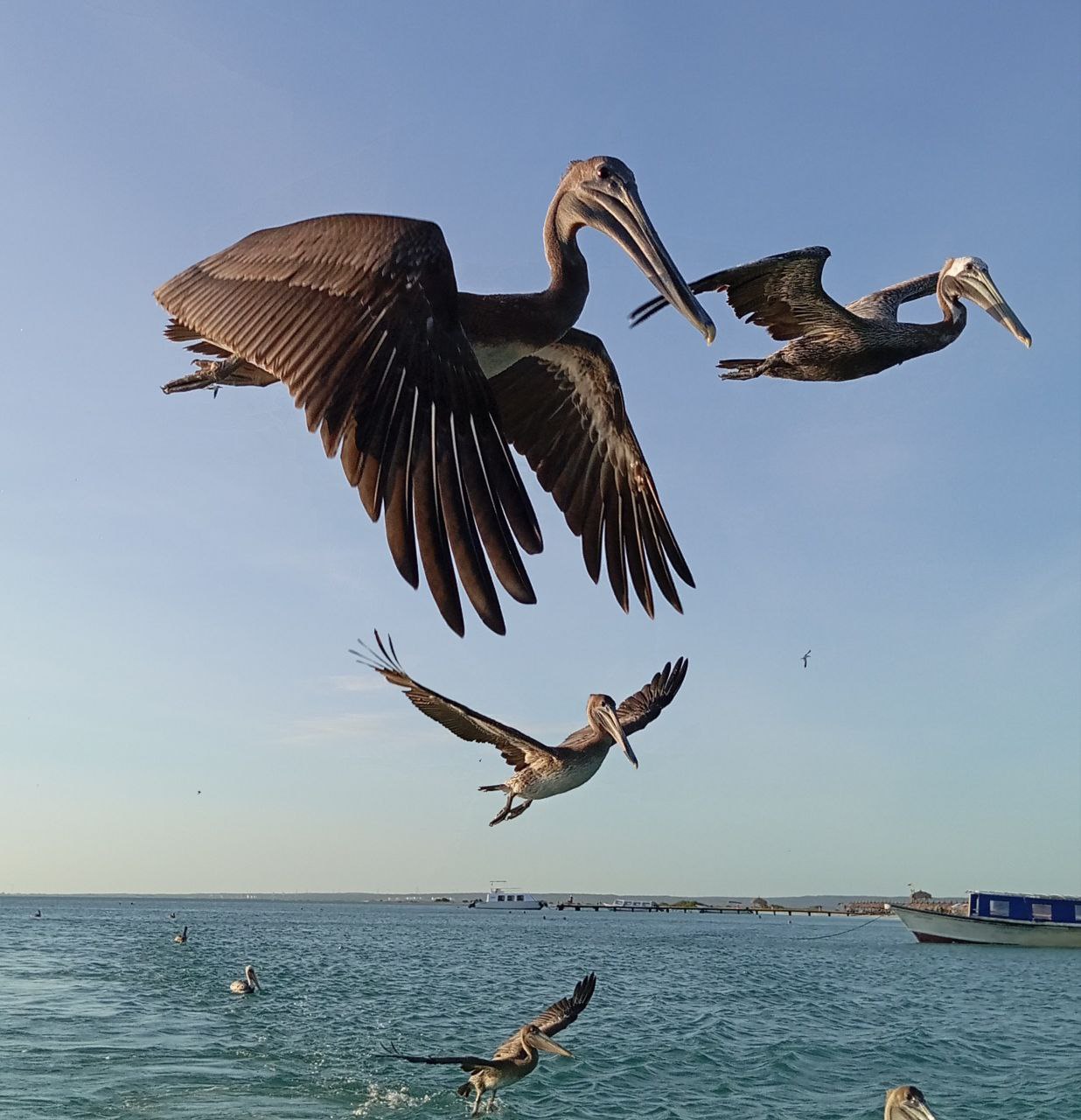 И тут над нами начинают кружить пеликаны! Огромные, с этими своими клювами. Они подлетают прям к нам, и тут мы понимаем, что они нас атакуют! Нам и смешно, и страшно, вдруг что, но больше смешно, если честно. Мы разворачиваемся и быстро плывём обратно, обсуждая, как мы одного сейчас поймаем и вечером зажарим на барбекю!