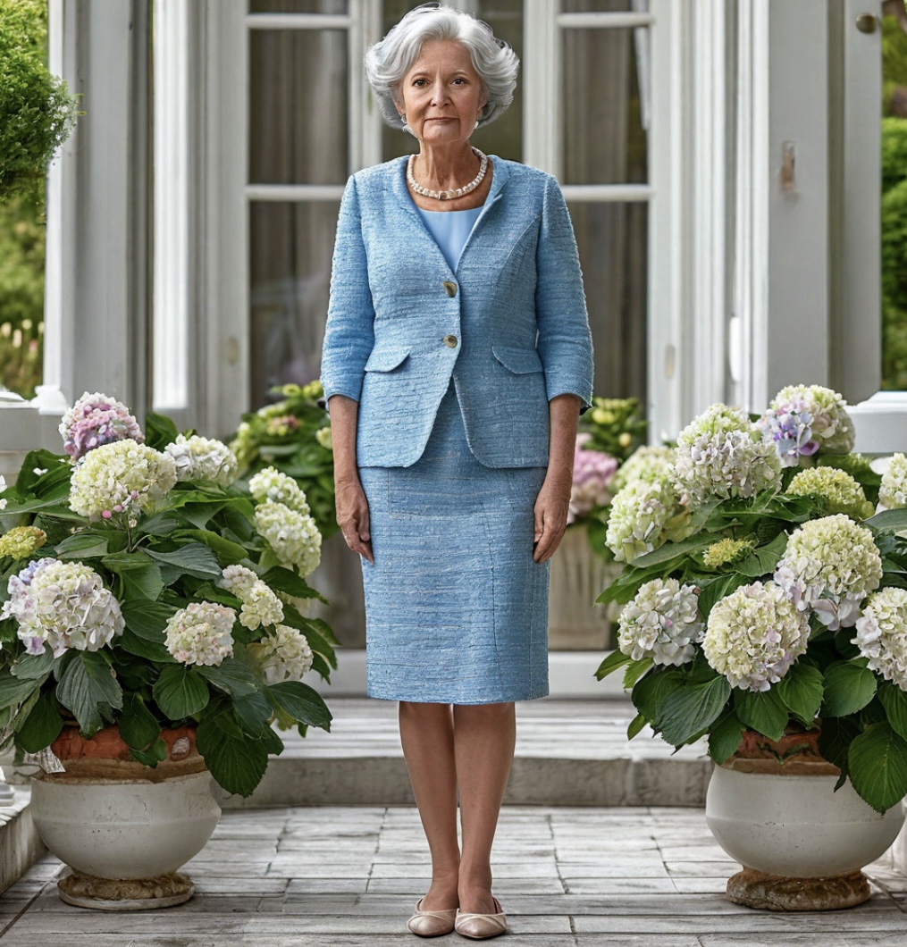 Ба уже стоит на террасе и встречает нас. Сегодня она в своём любимом образе королевы Елизаветы. Костюм нежно-голубого цвета, сочетается с фасадом дома и её глазами. А на ногах балетки под барашка. Интересно, это её мама так примоднила или она сама освоила Ламоду?