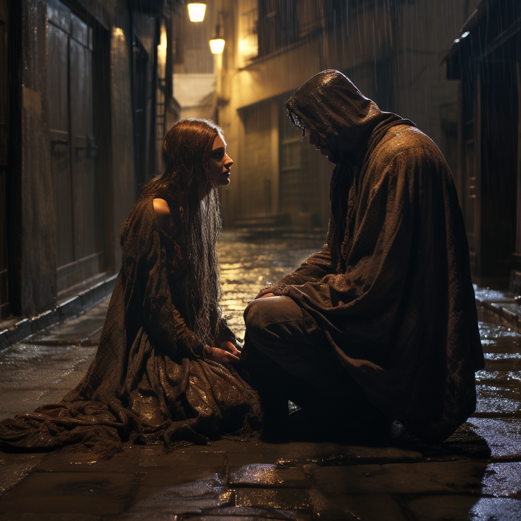 Похоже, в этот вечер действительно встретилась с Погонщиком Тьмы. Сжала в руке кулон и мешочек с монетками, поднялась с земли на трясущихся ногах и, кутаясь в плащ, побрела в сторону своего угла для ночлега. На те деньги, смогла протянуть ещё полгода, но работу продолжала искать, чтобы не остаться без денег совсем. Шла с очередной таверны, получив отказ в подработке и склонив голову, размышляла, как мне быть дальше. Денег почти не осталось, найти работу не могла уже неделю, средств чтобы покинуть город и безопасно добраться до другого, тоже не было. Брела по улице, предаваясь отчаянию и унынию, когда почувствовала, как меня кто-то трясёт за рукав и зовёт.