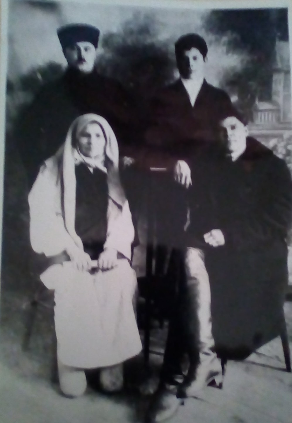 На стульях сидят карткартиней Мустабике и Махмуд Ахтямов, фотография 1933 года, Габдулла Ахтямов окончил педагогический институт в городе Уфе, вся семья собралась в городе Уфе и сфотографировались по этому поводу, Мустабику эби привёз на машине Махмуд Нуррахманович, он курировал колхозы и в его распоряжении был автомобиль ГАЗ-А с личным водителем. Стоят сверху Нурлан Нуррахманович Ахтямов, он пошёл по партийной линии и работал в городе Уфе и справа от него со стороны зрителей молодой Габдулла Ахтямов, он как раз окончил Педагогический институт.