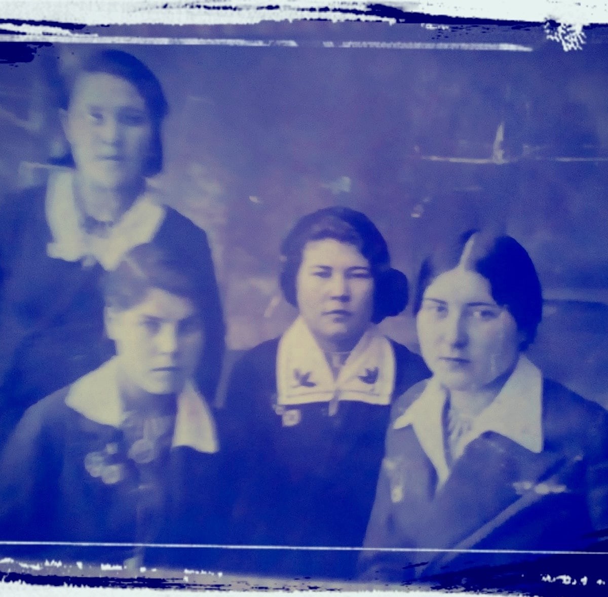 Фотография бабушки Муслимы, она сидит крайняя слева, у неё короткие волосы прическа хорошо держится за счёт гребня для волос, с такой прической Муслима прожила всю свою жизнь.