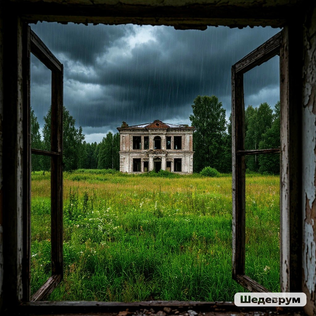 Погода совсем испортилась, начал накрапывать дождик, за-то стало хоть что-то видно. Девушка огляделась: совсем не далеко от неё оказалась старинная постройка неизвестного назначения, полуразвалившаяся, но, постоять в ней во время дождя было можно. Саша зашла внутрь , села на корточки и, поглядывая в сторону дверного проёма, стала ждать окончания дождя.