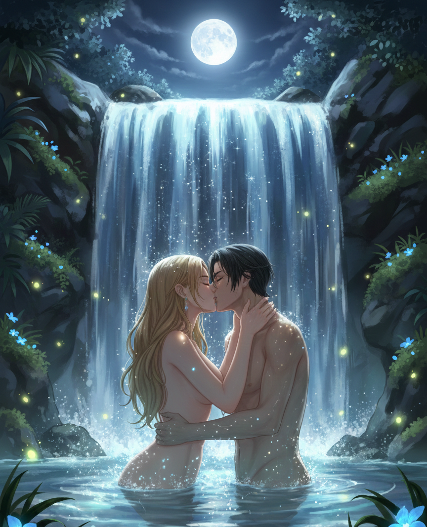Я подплыла к нему ближе, пока сияющая вода не достигла моей груди. Я обхватила его за талию, прижалась к его мокрой, горячей коже. Он вздрогнул, но не оттолкнул. Одна его рука осторожно легла мне на спину, другая поднялась к моему лицу. Он откинул прядь мокрых волос, прилипших ко лбу, и убрал её мне за ухо. Его пальцы коснулись кожи так нежно, будто боялись оставить след.
