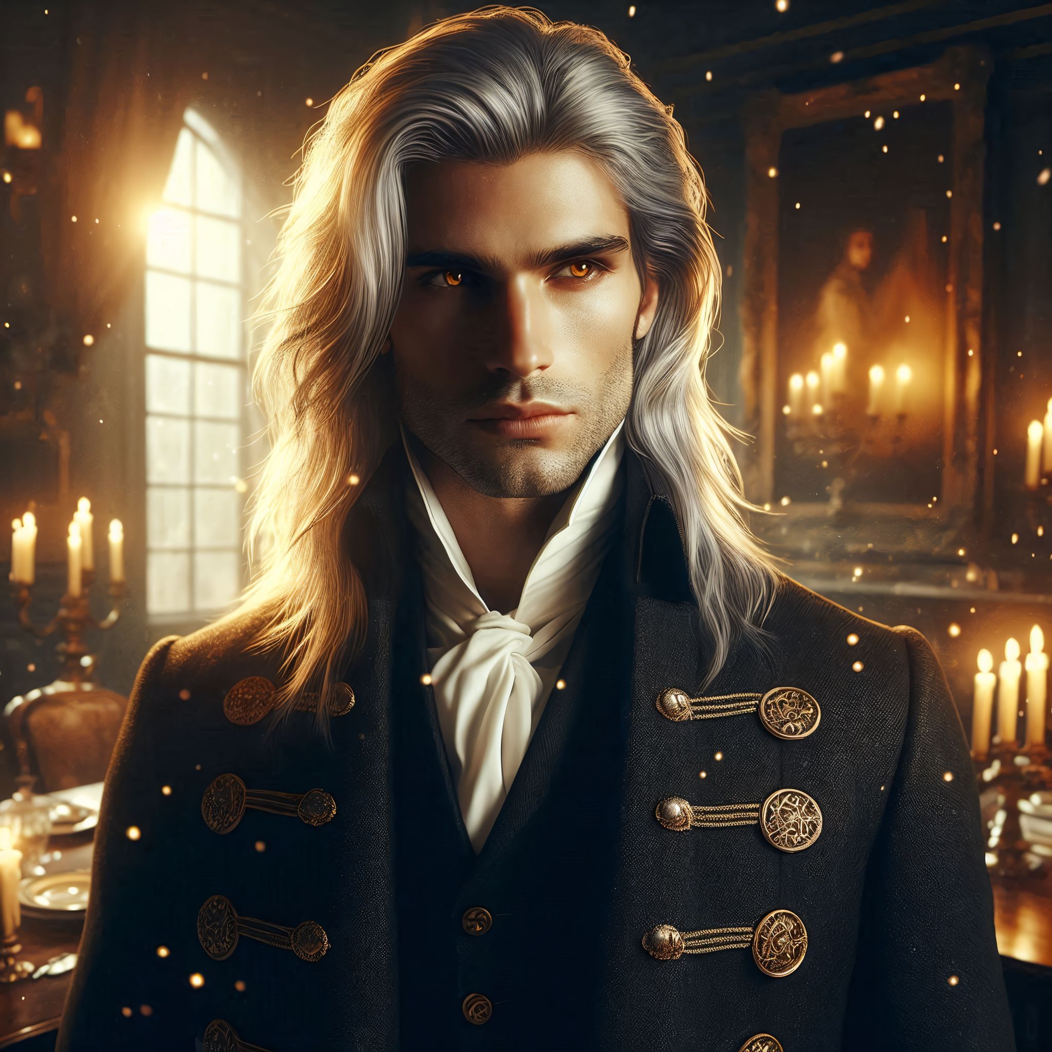 Возле прилавка, также с подносом в руках, стоит высокий мужчина. Он одет не в форму адепта, а в идеально сидящий чёрный фрак с золотыми пуговицами. Его платиновые волосы, чуть ниже плеч свободно распущены. Должно быть, он выбирает свой ужин не торопясь.