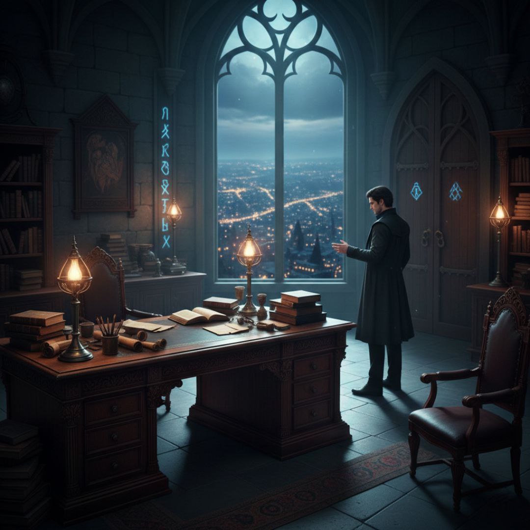 Высокий, с прямой спиной и холодным взглядом стальных глаз, он будто нёс с собой само спокойствие. Но это было не мирное спокойствие тихого озера – это была ледяная неподвижность перед бурей. Длинные тёмные волосы были отброшены со лба, открывая резкие, почти суровые черты лица. Строгая чёрная мантия с серебряными рунами, вышитыми по краям и воротнику, подчёркивала его статус. Руны тускло мерцали, откликаясь на магический хаос в комнате. Казалось, само пространство вокруг него стало куда более плотным и тяжёлым, словно воздух сгустился.