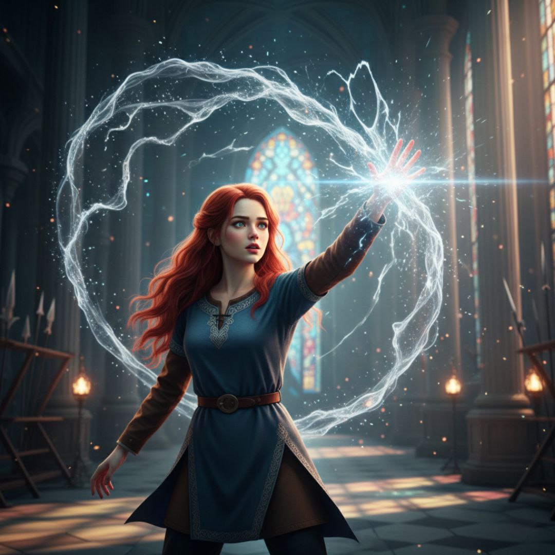 В эпицентре этого магического хаоса стояла девушка с растрёпанными алыми волосами и искрящимися глазами. На её лице читалась смесь удивления и плохо скрываемого восторга. Её пальцы слегка подрагивали, а вокруг ладоней вились тонкие нити света, словно живые змейки.