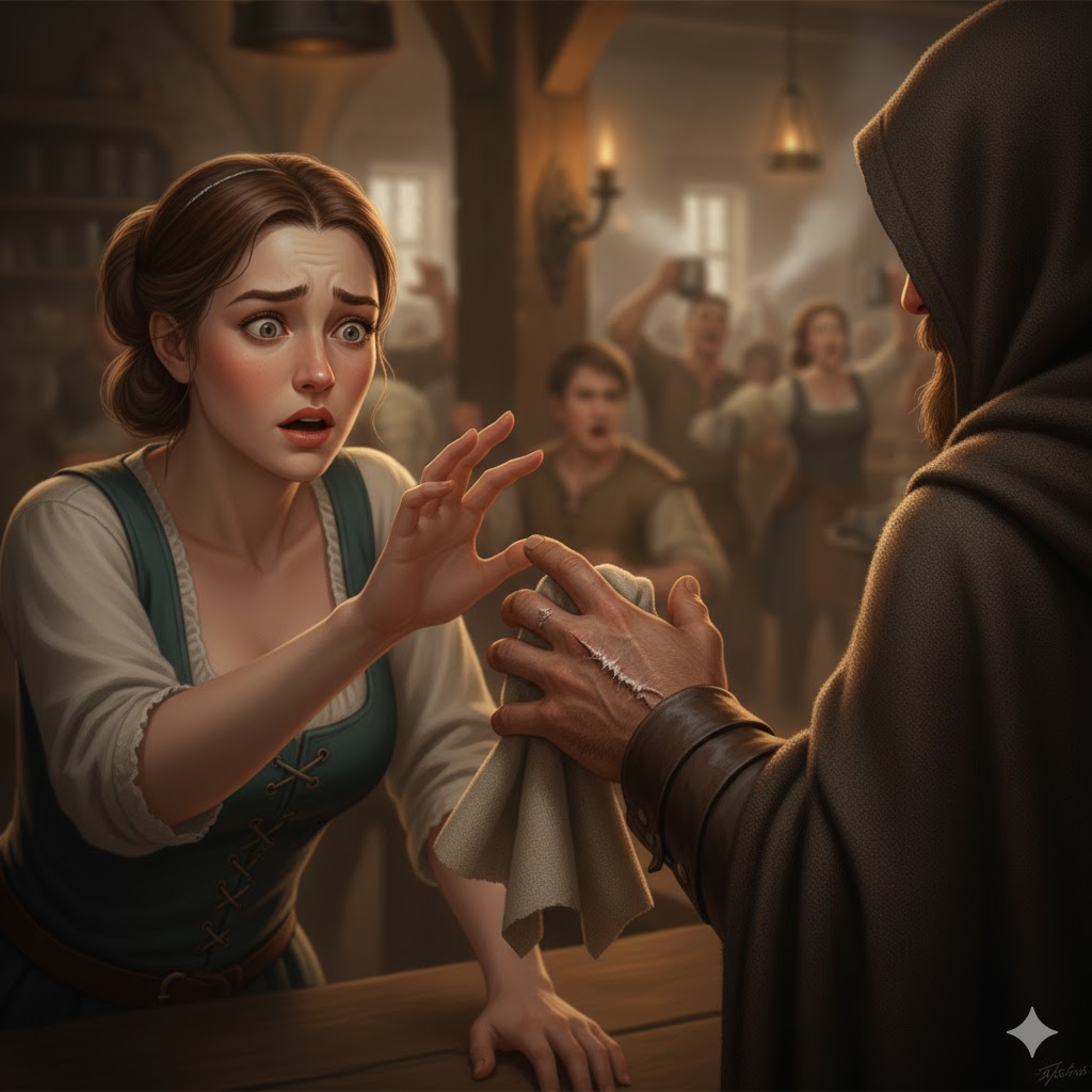 Каждый его шаг отдавался в тишине зала глухим стуком подошв по деревянному полу. Он шёл не спеша, но без колебаний. Его руки были спрятаны в складках плаща, капюшон по-прежнему скрывал лицо. Арина непроизвольно выпрямилась, отбросила тряпку и приняла свою хозяйскую позу — руки на стойке, подбородок чуть приподнят. Защитная стена.