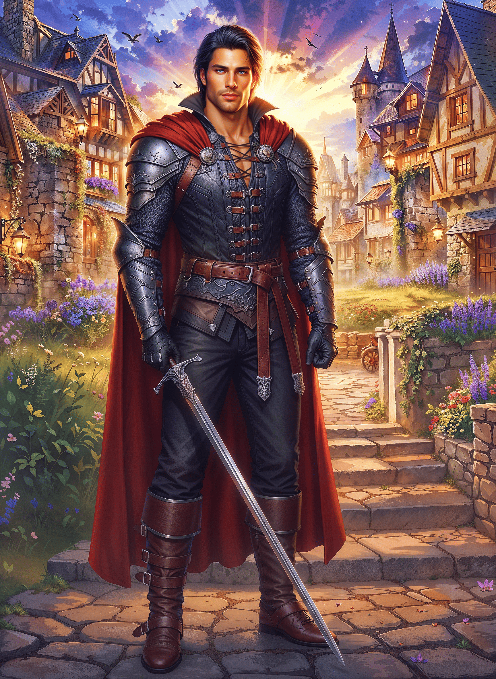 Кожаные темные доспехи закрывали моего спасителя по пояс, металлические наплечники блестели в пляшущем свете, на красном плаще золотой нитью вышит сложный узор, а в руках… Настоящий меч!