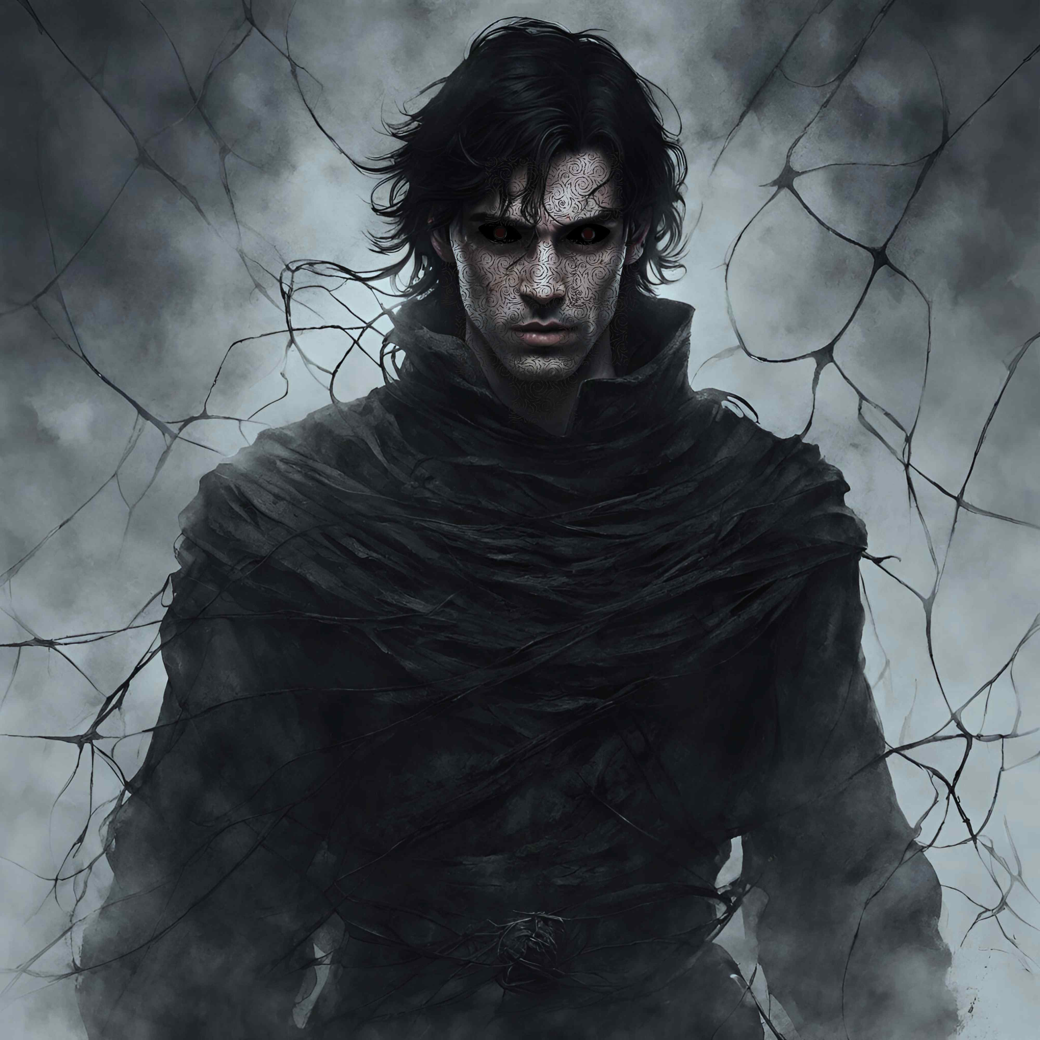 На полу сидел мужчина с неестественно выпрямленной спиной. Его глаза были черны как ночь, а лицо было окутано узором из чёрных нитей и завитков. Вокруг него пульсировала красная мерцающая сфера.