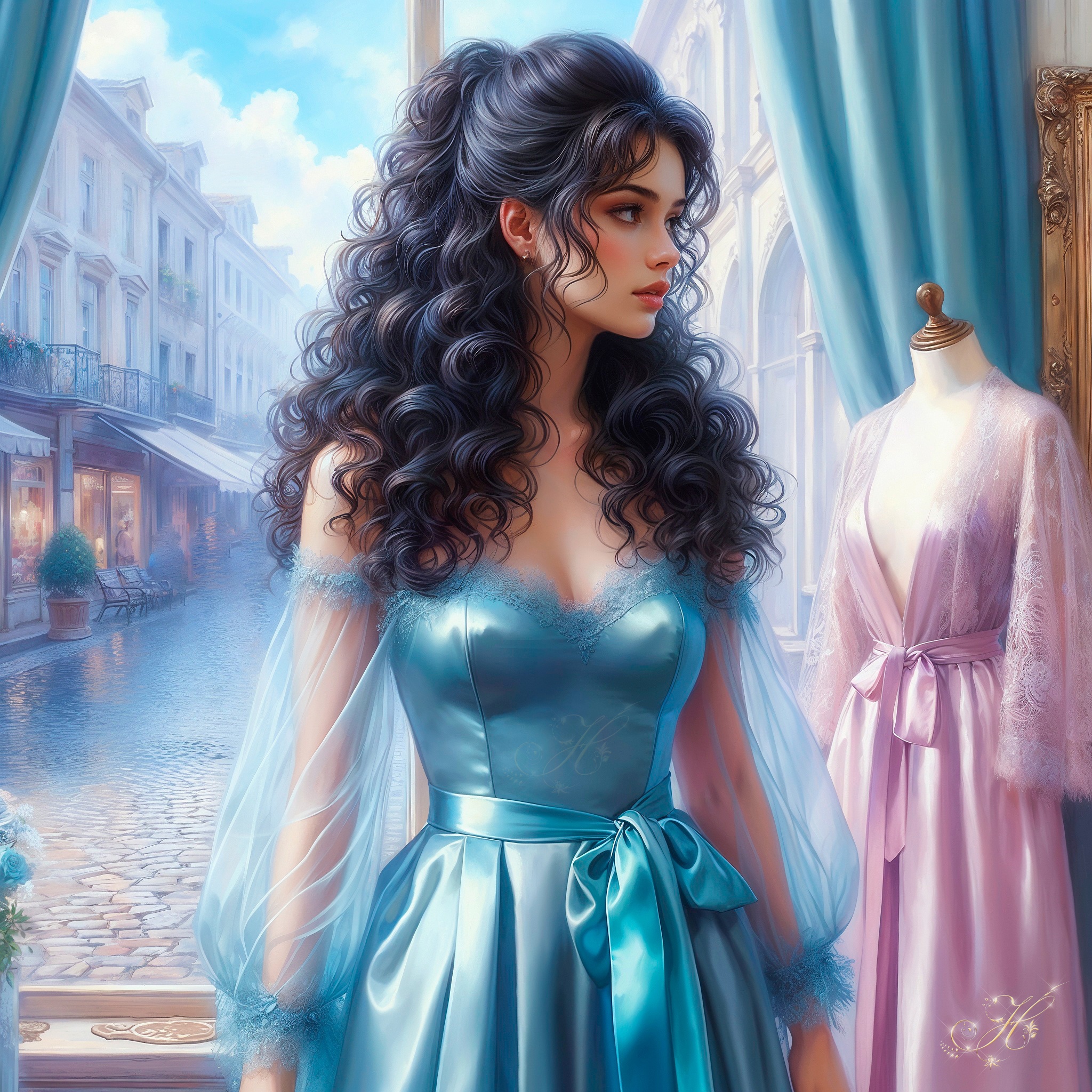 Дракон пока не спешит заходить в лавку. Вместо этого он оценивающим взглядом скользит по манекенам с бельем, бархатным диванчикам, обитым пурпурным бархатам, прилавку, где лежат кружевные предметы дамского гардероба и... нам с Дэллой.