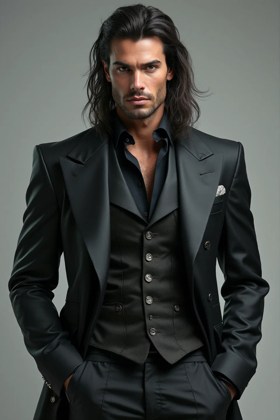 Вот только сейчас передо мной стоял статный, довольно молодой мужчина в накинутом на голое тело бархатном халате. По его обнажённой коже скатывались капли воды. Чёрные, чуть вьющиеся волосы свисали мокрыми прядями.