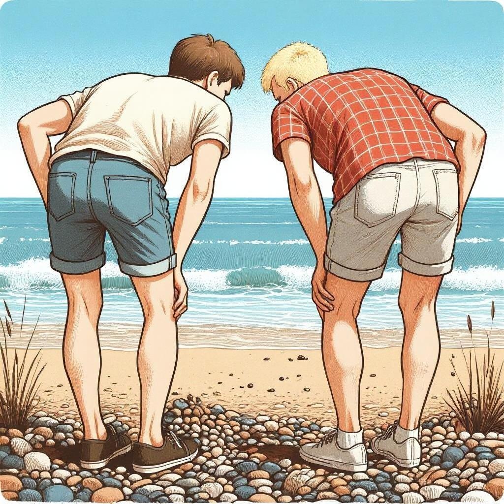 Парни явно что-то искали, наклонившись и внимательно изучая мелкие камушки под ногами.