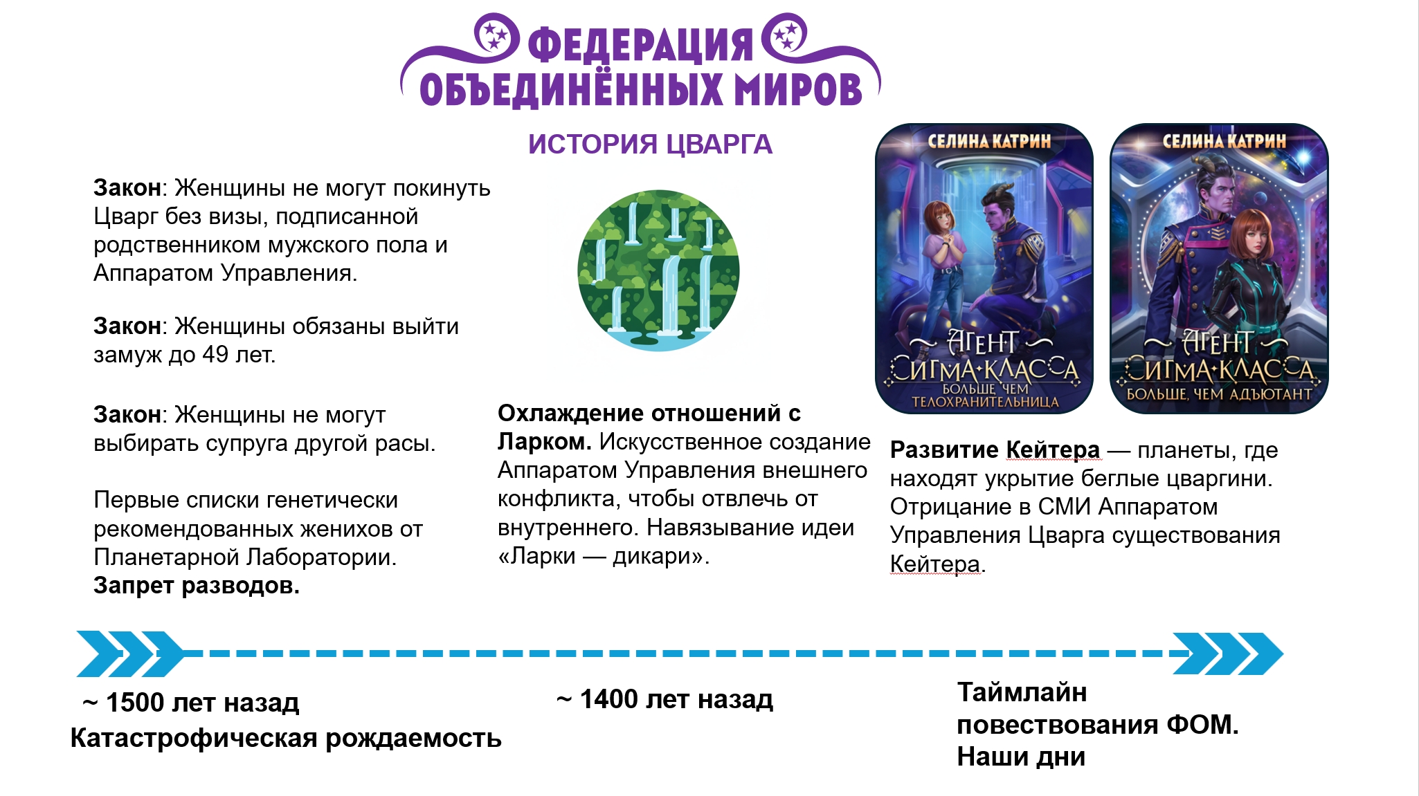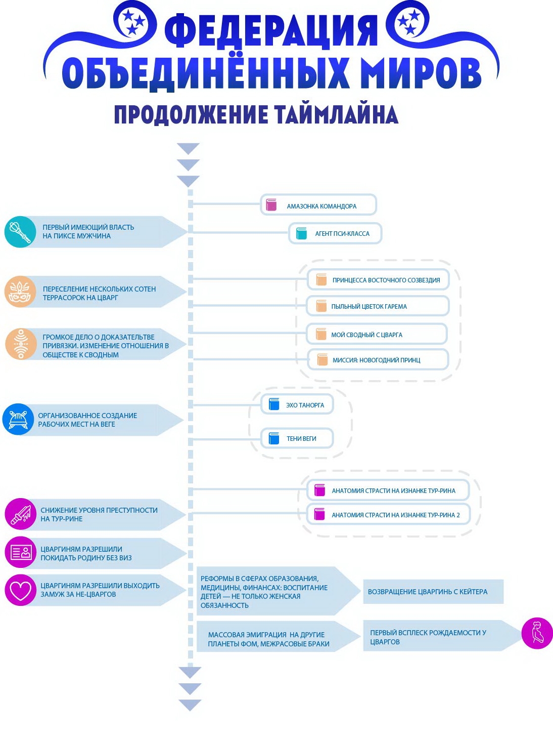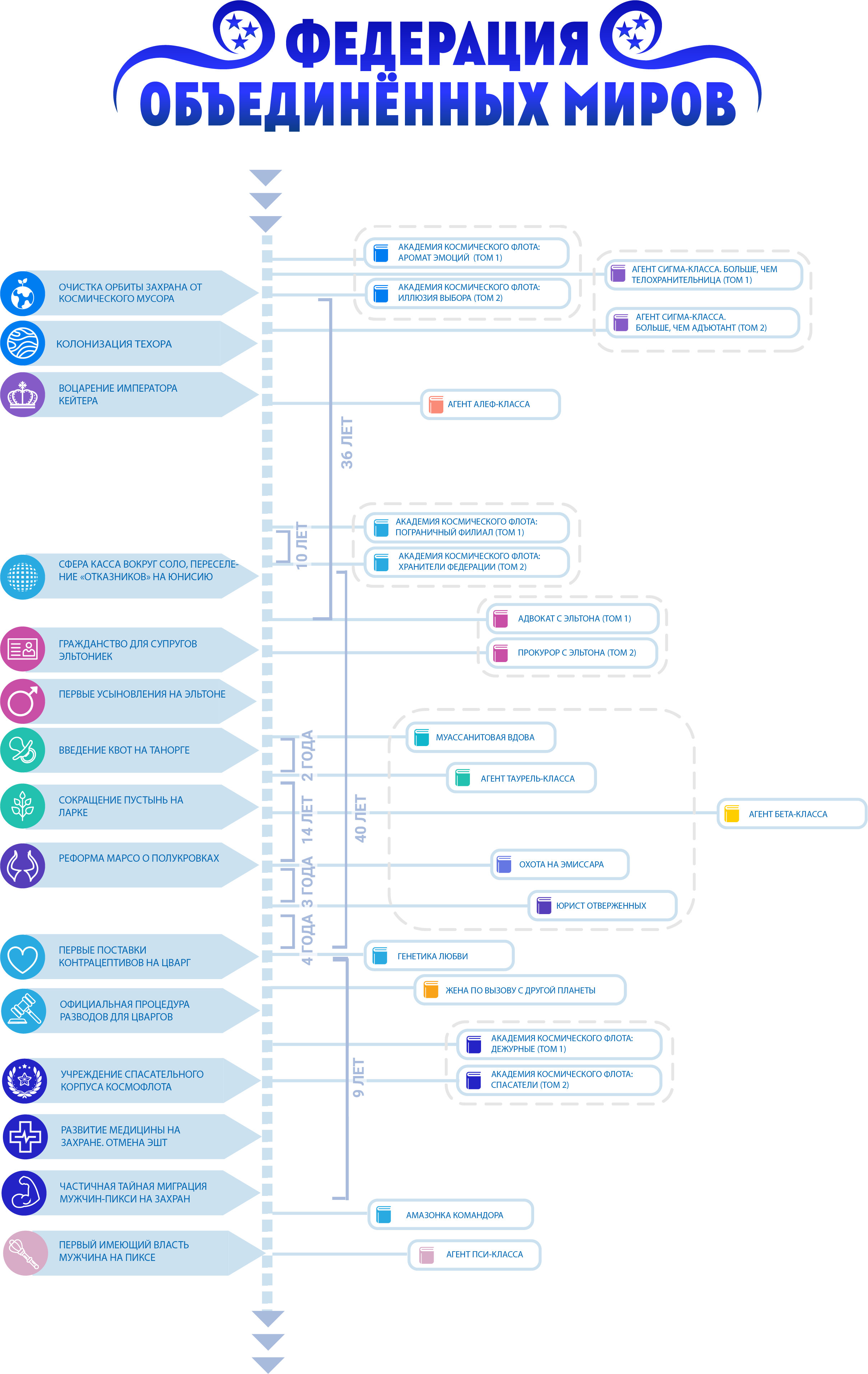 Слева от вертикальной таймлайн-линии написаны события планетарных и галактических масштабов, которые произошли на территории Федерации. Цвета иконок совпадают с цветами книг, это необходимо читать как "События данной книги привели к такому результату". Например, результатом книги "Академия Космического Флота: Иллюзия выбора" стало то, что Анестэйша при помощи оставленного наследства очистила орбиту Захрана от космического мусора.