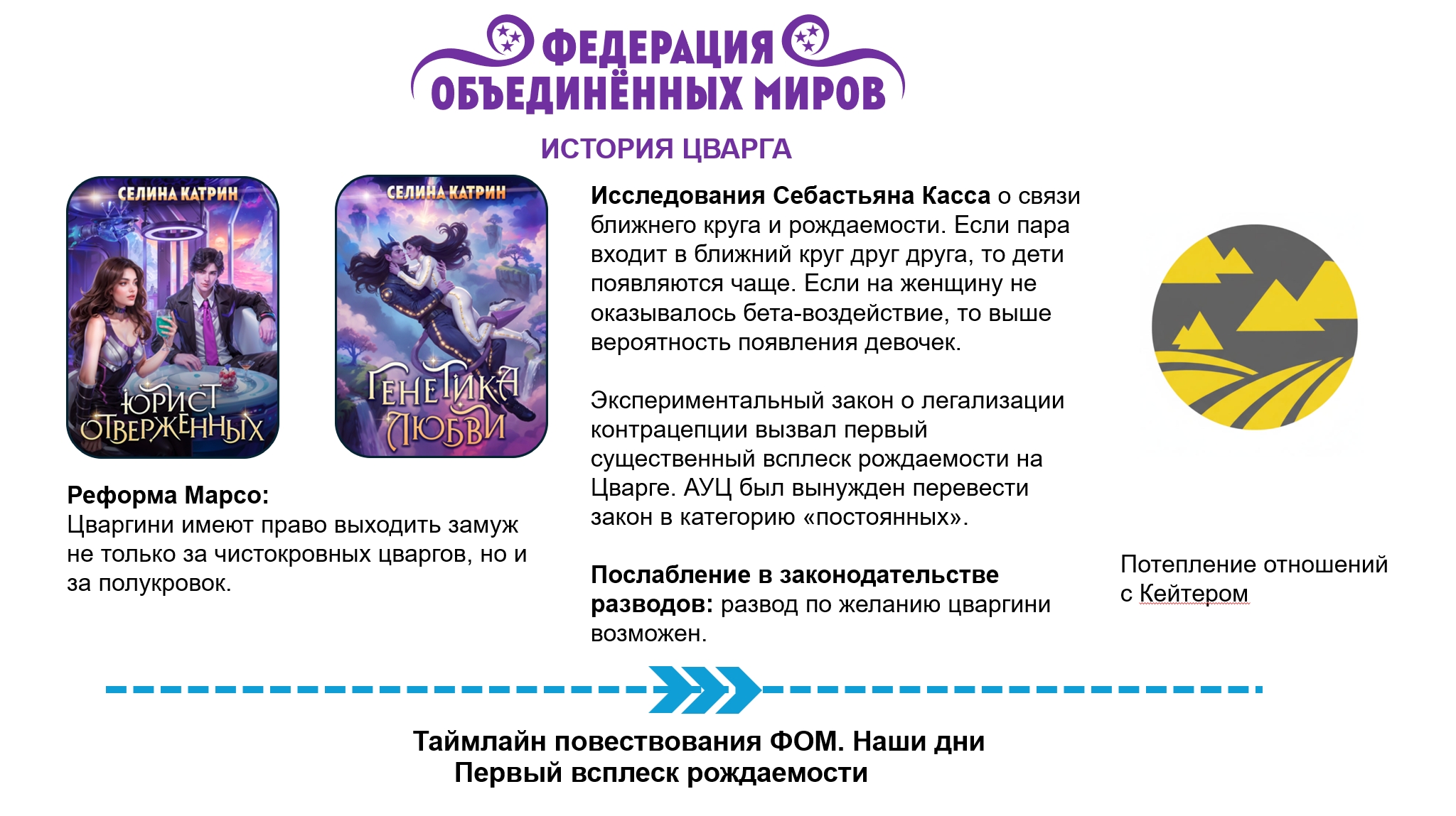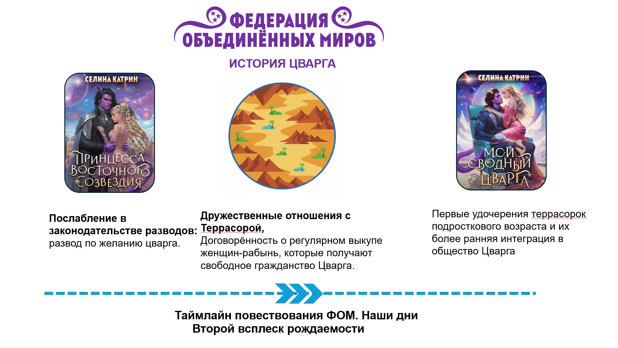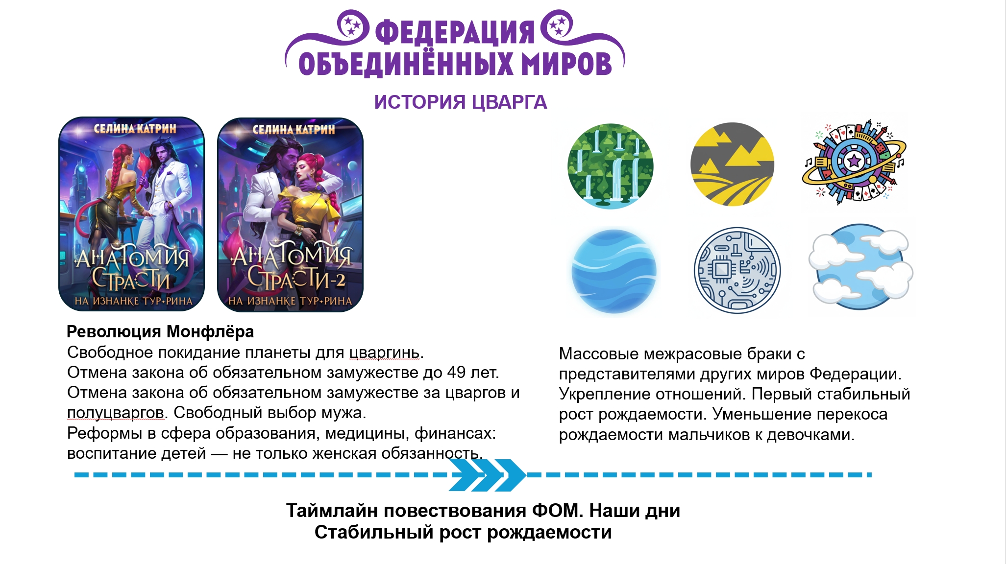 Слева от вертикальной таймлайн-линии написаны события планетарных и галактических масштабов, которые произошли на территории Федерации. Цвета иконок совпадают с цветами книг, это необходимо читать как "События данной книги привели к такому результату". Например, результатом книги "Академия Космического Флота: Иллюзия выбора" стало то, что Анестэйша при помощи оставленного наследства очистила орбиту Захрана от космического мусора.
