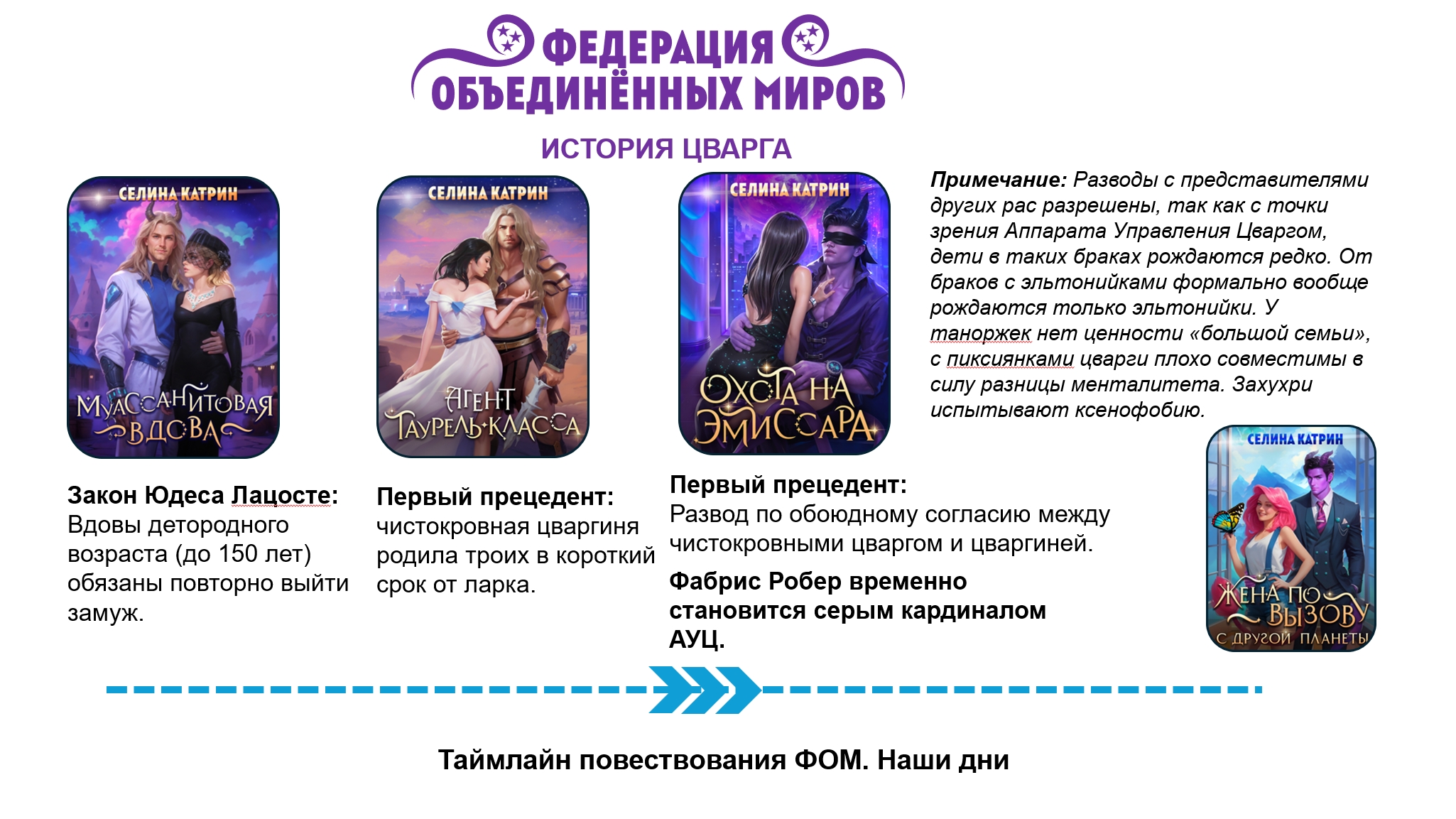 Ниже приведён таймлайн по циклу "Федерация Объединённых Миров". Читать следует сверху вниз. Справа даны названия книг, серой пунктирной рамкой обведены книги, которые рекомендуется читать вместе.