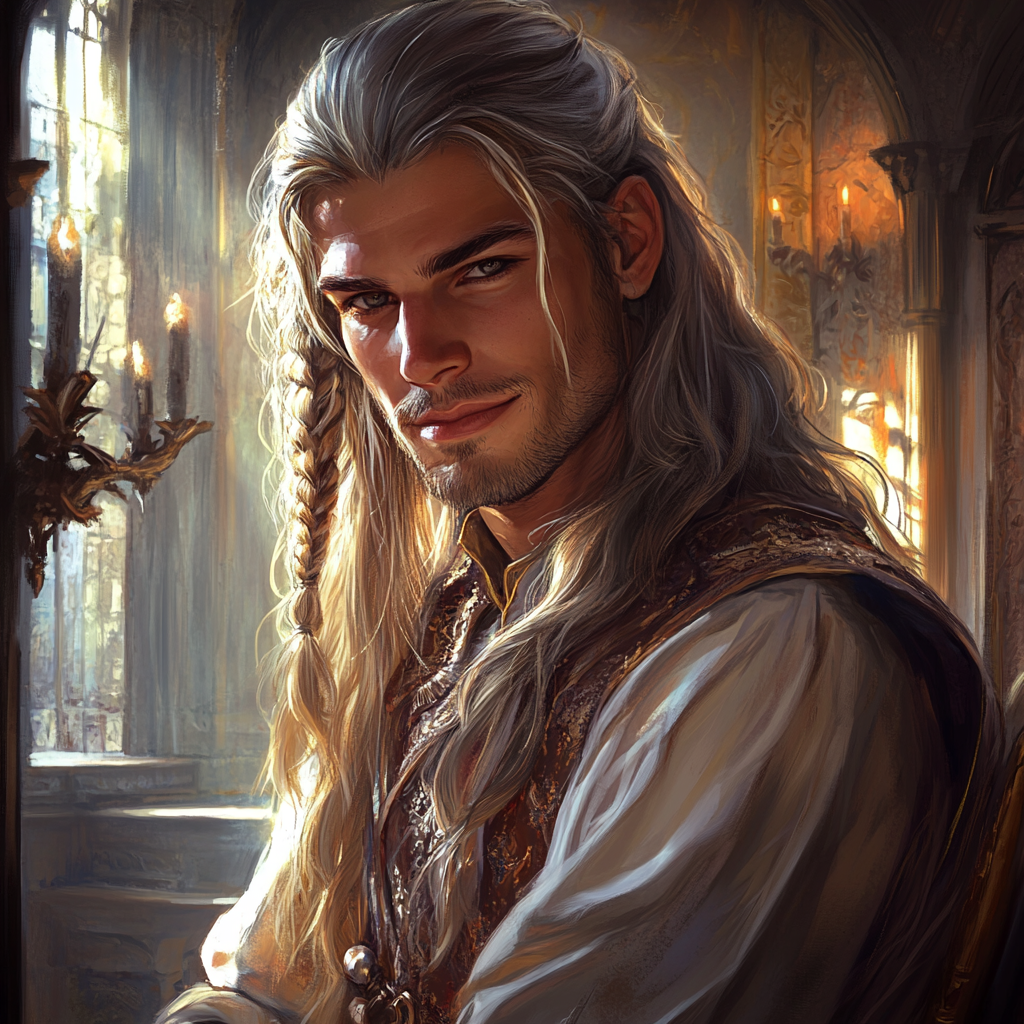 Высокий пепельный блондин, среди длинных прядей волос видны две тонких косицы аккуратного плетения.