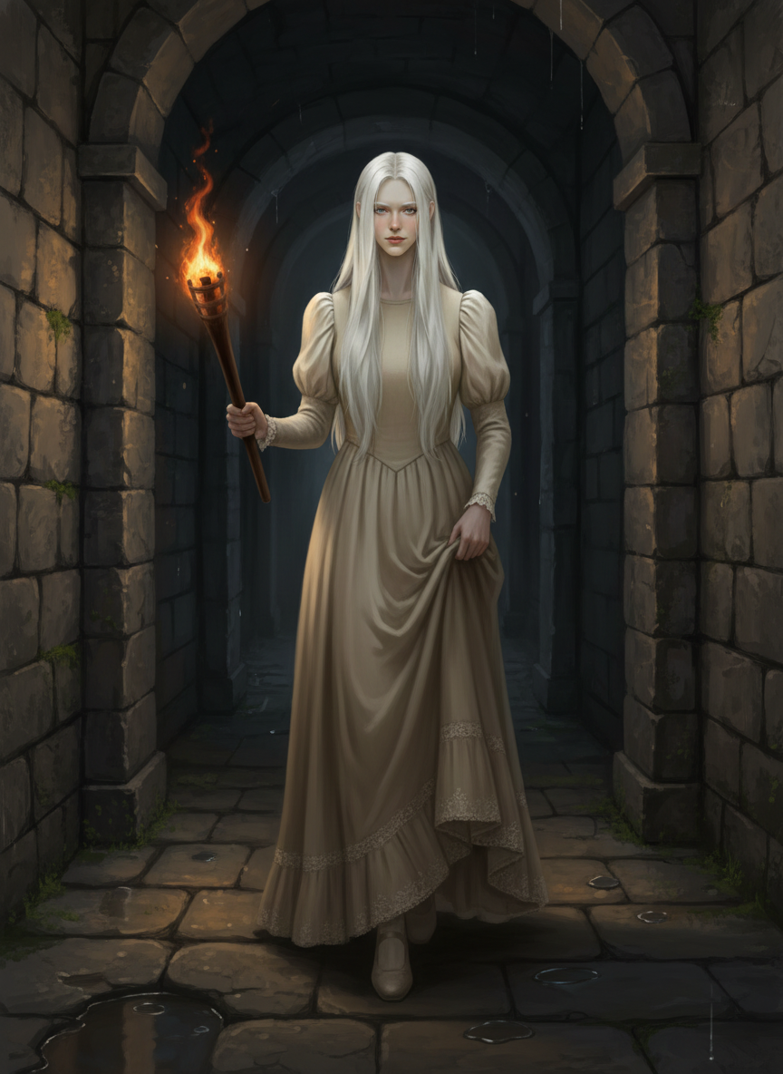 Дверь — тяжёлая, каменная, которую я раньше не замечала, — бесшумно распахнулась. В проёме возникла девушка. Она была одета в простое платье бежевого цвета, закрывавшее её с шеи до самых пят. Её волосы, белые, как первый снег, ниспадали прямым водопадом. Но больше всего поражали глаза — бледные, почти прозрачные, они сливались с белками, делая взгляд призрачным и неприятным. Словно глаза мертвеца.