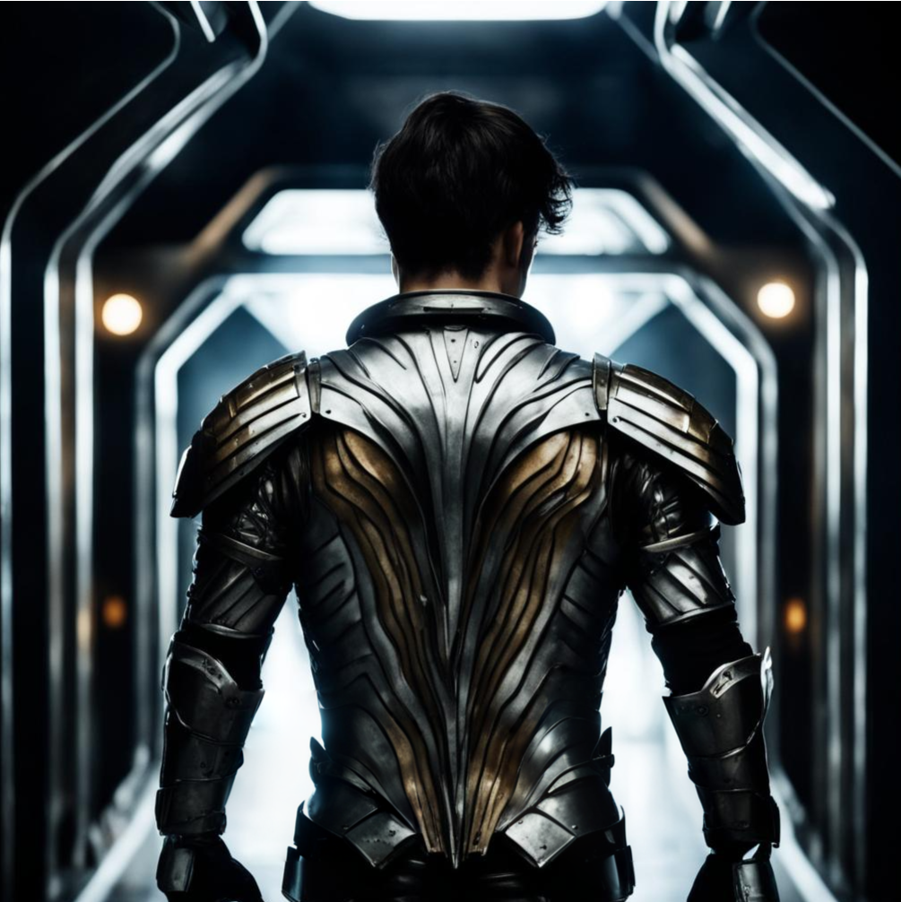 Ноги закованы в пластины, как на рукавах, и там скрываются стабилизаторы – очень помогают в полёте. Или в падении. Штаны и обувь почти прикрывает шикарная разлетающаяся юбка в виде рыбьего хвоста. Она представляет собой каркас, между которым натянута тончайшая наноткань.