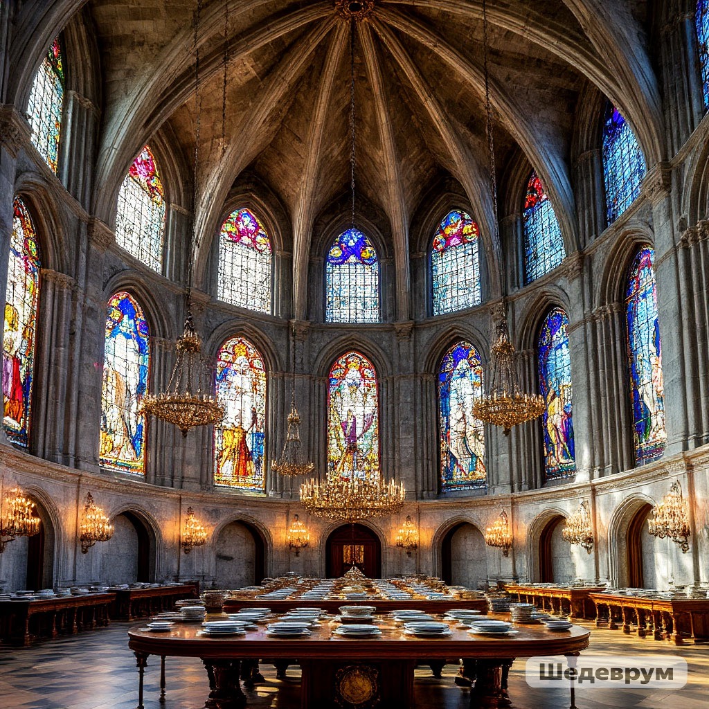 Во-первых, таких огромных помещений я никогда не видела. Все виденные мною залы в старинных замках и современных зданиях на Земле не идут ни в какое сравнением. Больше всего поражала высота потолков и сама его конструкция из полусфер, казалось, что над тобой пупырчатые своды или, скорее, соединение огромных куполов. Стены и пол были полностью из мрамора серых оттенков. Свет местного светила проходя сквозь огромные витражные окна с изображением крылатых существ, рассыпался разноцветными лучами по всему помещению, отчего бледный серый зал начинал играть разноцветными красками. По центру потолка на цепях свисали огромные люстры, а под ними стоял огромный стол, заставленный разными блюдами. Но больше всего меня шокировало не размеры и убранство зала, а нелюди, присутствующие на этом мероприятии. В огромном зале, за огромным столом сидели огромные люди, самые настоящие великаны. Когда один из них встал, чтобы проводить меня к моему месту, тогда я и поняла на сколько отличаюсь от них ростом. Провожавшему, например, я еле доходила до подмышки.