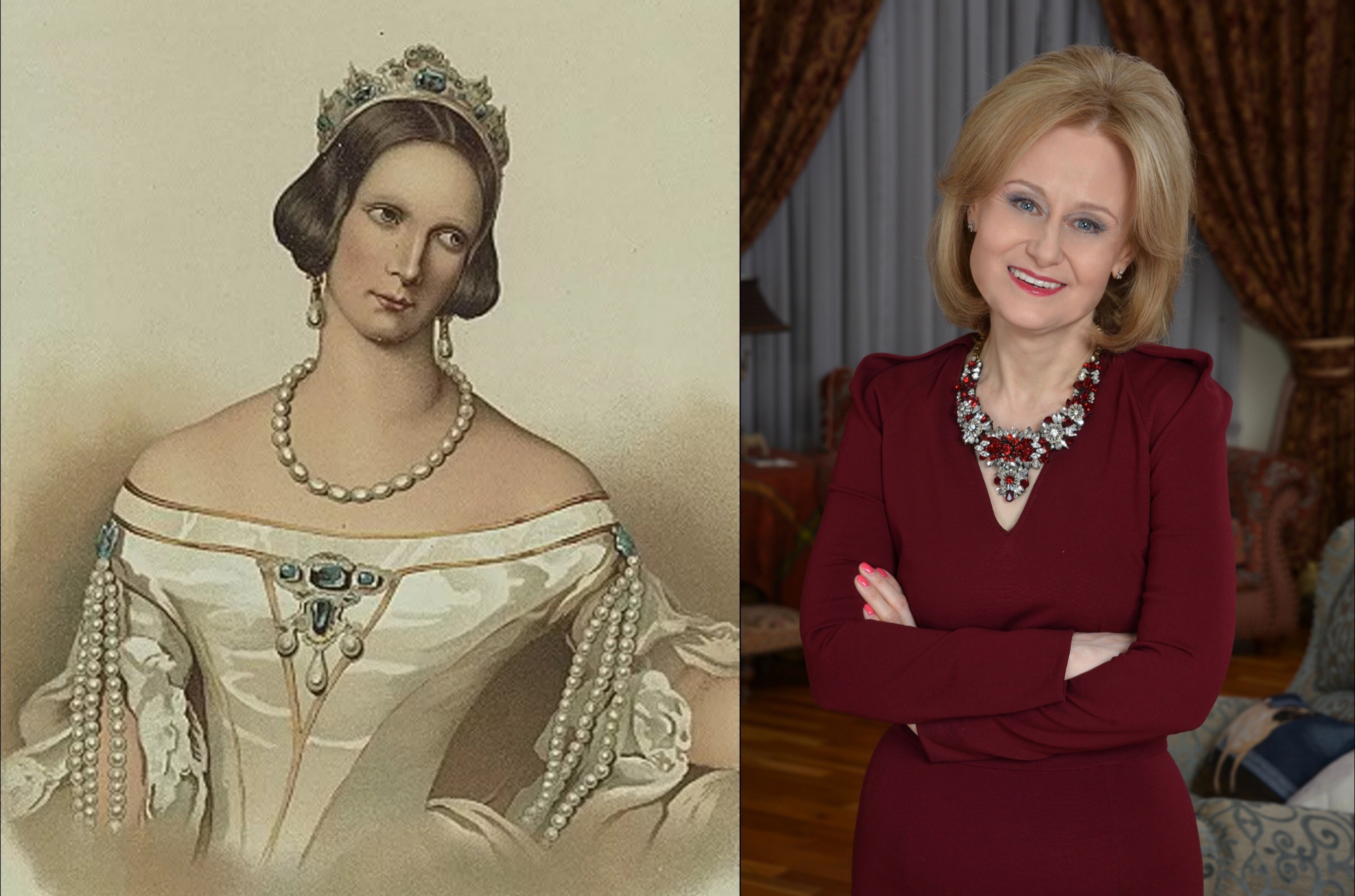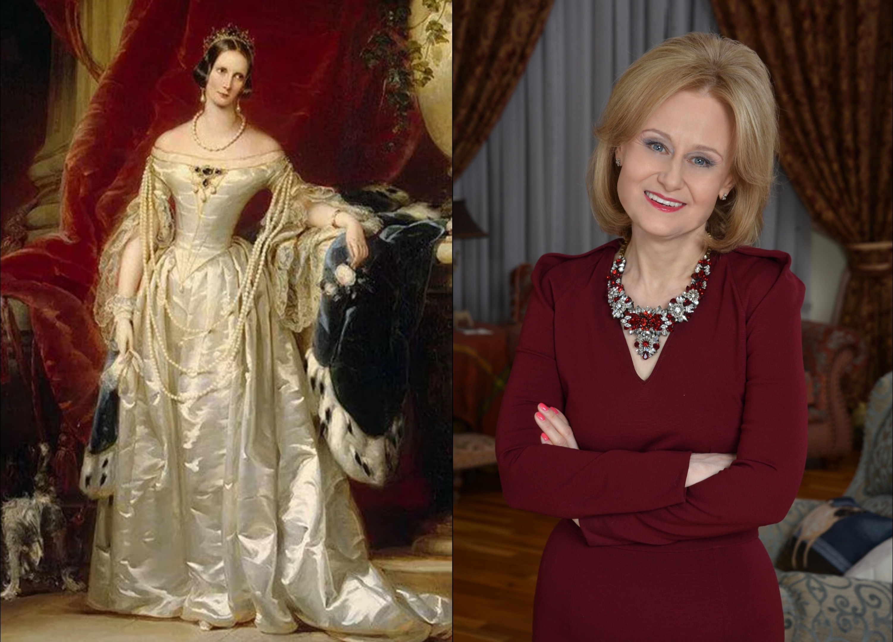 Коронационный портрет императрицы Александры Федоровны и фотография писательницы Дарьи Дворцовой в красном костюме. Императрица Александра Федоровна стоит у урны с прахом императора Павла l, потому что Павел l умер в августе 1825 года, а в декабре 1825 года в результате военного противостояния войск Александра l Павловича и войск Николая l Павловича и в войсках Николая l были Строгановы с Измайловским и Семёновским полками, а у Александра l были всем известные декабристы, которых после отправили в Сибирь строить военные крепости на границе у озера Байкал.