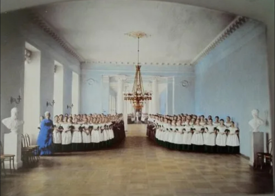 Смольный институт был похож на казармы со спальнями на 30 человек, классные комнаты и помещения были огромными, учили Смолянок в Смольном институте Закону Божию, чистописанию и Русской литературе, Французскому языку и обязательно Германскому языку, если вдруг Смолянка попадёт в Эрмитаж фрейлиной и будет общаться с женой цесаревича или императора, то им был необходим Германский язык, для общения с Германскими принцессами при дворе императора Николая l или императора Александра ll. Также Смолянки обучались Математике и Физике, Истории и Географии, Смолянки обучались танцам, пению и занимались физкультурой, а последний выпуск Смолянок в 1918 году почти весь пошёл в Женский батальон.
