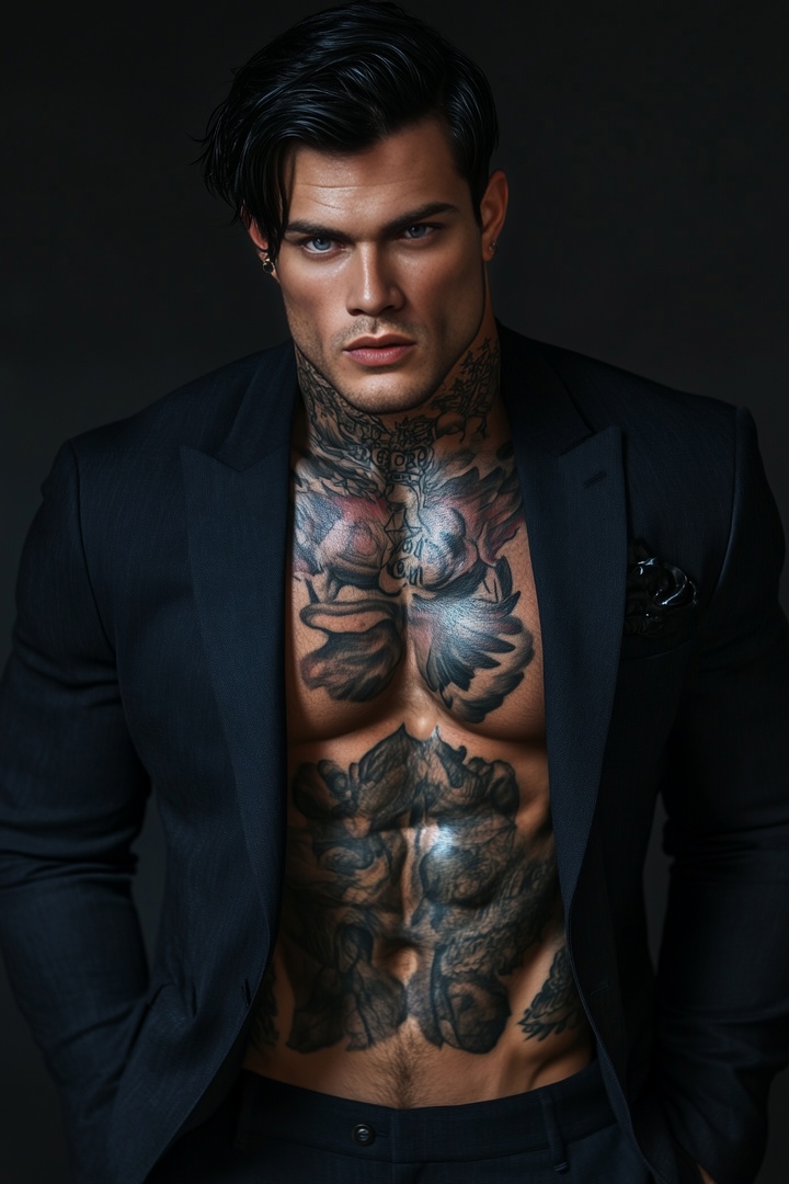 Пространство вокруг подъезда и дороги ярко освещал фонарный столб. А подняв взгляд, увидела татуированного парня в чёрных джинсах, белой футболке, отчего татушки на его загорелой коже стали ещё ярче смотреться. Глаза резко контрастировали с чёрными, цвета воронова пера, волосами. Его накаченная задница восседала на капоте спортивной машины, по виду жутко крутой и жутко дорогой.