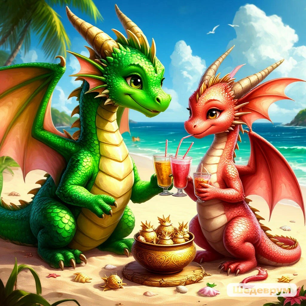 Где-то на дальних берегах, на драконьем пляже... красивый зелёный дракон в самом рассцвете сил и лет с чёрными пятнами пытался познакомиться ближе с очаровательной драконицей, всей в золотисто-розоватых чашуйках, предлагал ей напитки на выбор и намекал на создание собственного гнезда с маленькими дракончиками, дарил цветы и фрукты, даже золотую пластинку с узором на коготок. И выглядел даже мило рядом с ней. Но, вдруг( где-то далеко в замке сработало заклинание по возвращению драконов и подчинению хозяину) наш знакомый зелёный красавец весь изогнулся, выразился по-драконьи неприлично и исчез в воздухе. Драконица, уперев передние лапки в бока, недовольно выразилась: "Ну вот, как только доходит до серьёзных отношений, все они начинают грубо выражаться, а потом исчезают! Ни за что замуж не пойду!"