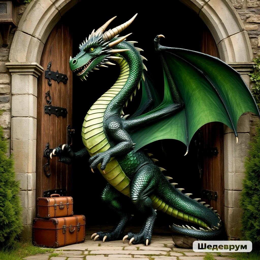 Он схватил какие-то чемоданы в передние лапы, которые, оказывается, все это время стояли по обе стороны от дракона, и с гордо поднятой головой, прошествовал на задних лапах на выход из замка, а потом , демонстративно , схватив дверную ручку кончиком хвоста, громко хлопнул дверью.