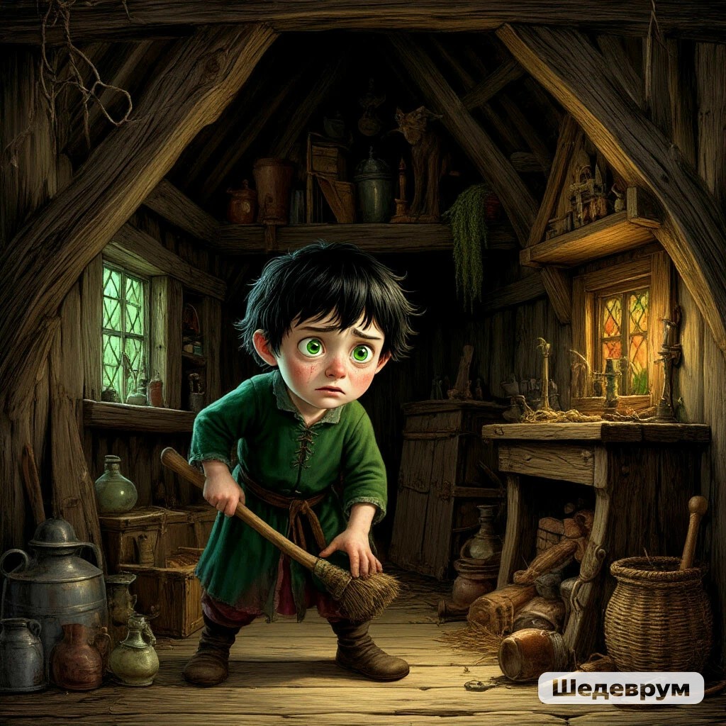 Бывало заберётся на чердак, тихо всхлипывает и злится, что ему опять приходилось бегать по всему волшебному лесу за ядовитыми травами, поганками и разными штуками, отбиваться от ужасных оборотней, готовых загрызть всё живое человекообразное или терпеть насмешки русалок, уносить клиентам и клиенткам старухи-ведьмы их заказы... Только вместо благодарности он, то и дело, получал пинок, шлепок тряпкой и ругань. В минуты тишины маленький будущий злой колдун ненавидел свою приёмную бабку, ненавидел её клиентов и клиенток, мечтал только об одном-отомстить им всем. Мечтал:" Вот стану взрослым злодеем, захвачу мир , стану правителем и всех этих уничтожу!" Разумеется ,он имел в виду своих обидчиков. Но, кто ж его научит колдовству? Люцилла не доверяла ему ничего, сама зелье варила, он редко ей помогал в этом. Лишь иногда подглядывал украдкой. Мальчишку такой расклад совсем не устраивал.