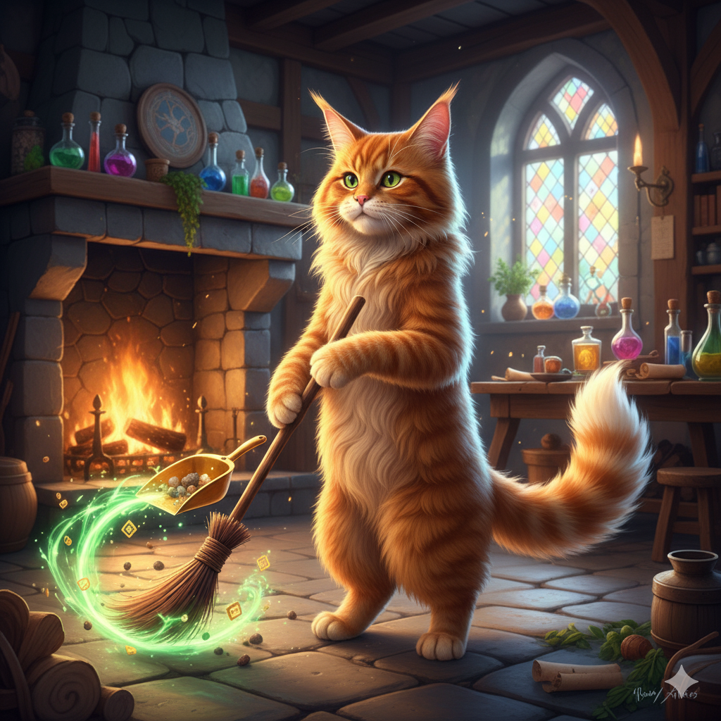 Кот на моё восклицание почти не реагирует. Только прядёт ухом, облизывается, нервно дёргает хвостом и продолжает убираться. На этот раз куда зрелищнее – животина взлетает над полом и крутится на месте, будто пытается догнать собственный хвост. С каждым его витком бардак вокруг уменьшается: целые колбочки взлетают на приколоченные над прилавком полки, битое стекло и жидкости исчезают, будто по волшебству.