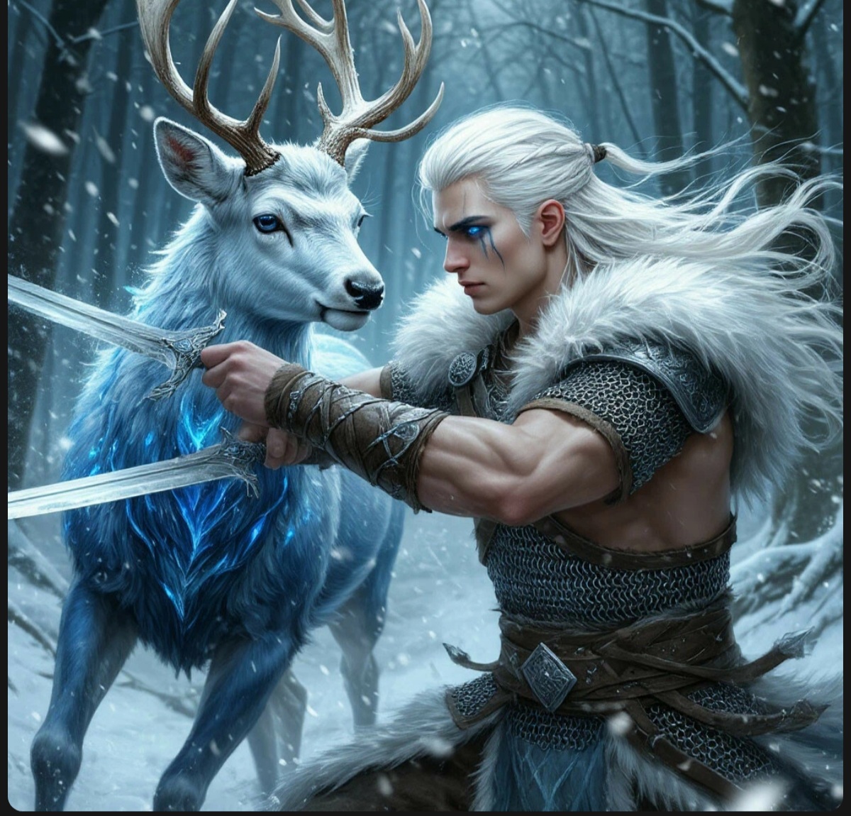 Он возник на границе миров, там, где соприкасались реальность и миф. Его рождение сопровождалось не громом и молниями, как у других божеств, а тихим шелестом падающего снега и мелодичным звоном В самом сердце древнего зимнего леса, где вековые ели хранят тайны веков, а снег искрится серебром под луной, обитает удивительное создание — Белый олень. Никто не знает, сколько столетий он бродит по этим заснеженным просторам, но местные легенды гласят, что это не просто волшебное животное. Это — Последний страж, древнее существо, наделённое способностью принимать облик прекрасного молодого мужчины с длинными белыми волосами и пронзительно-тёмно-синими глазами, в которых отражается мудрость тысячелетий.