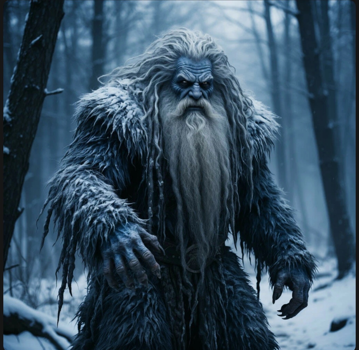Высокая, сгорбленная фигура скользила между деревьями, едва касаясь снега. Её глаза светились холодным голубым огнём, а изо рта вырывались клубы морозного пара. Это был Карачун — древний дух зимы, повелитель метелей и лютых морозов.