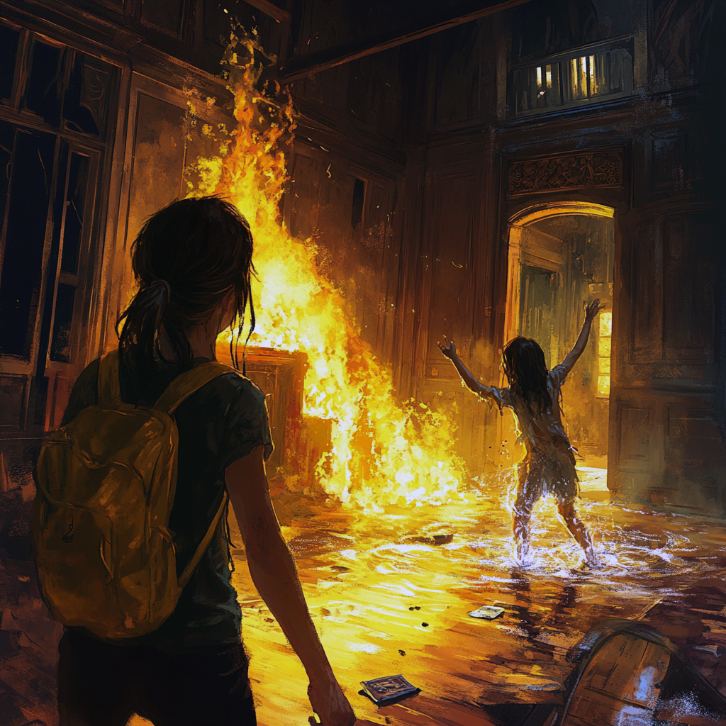 Вокруг стоял треск. Дым проникал в лёгкие. Дождей не было слишком давно, старый деревянный особняк, успевший хорошо просохнуть под палящим солнцем, горел как облитый бензином. Лиз со злости швырнула огненным шаром в бревно, и оно мгновенно покрылось задорными узорами пламени.