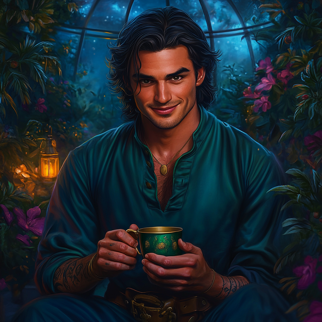 Я ожидала огромного тёмного зала со свечами и длинным столом, но меня привели в оранжерею. Под стеклянным потолком светились мягким сиреневым цветом кристаллы, воздух был свежий, наполненный цветочными сладостями.