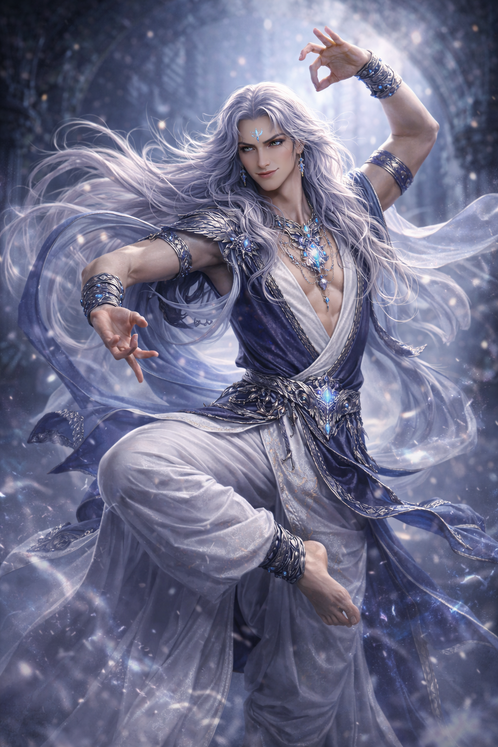 Как по заказу, за колонной появился длинный силуэт. Нет, не появился — выплыл. Шаяссараян. Три метра чистой изящной наглости и яда: гибкое тело королевской кобры, широкие плечи, тонкая талия, на груди поблескивали кольца, волосы струились по спине, как ночной шелк. Он двигался так, будто у пола были личные с ним отношения, и тот очень просил именно такого скольжения.