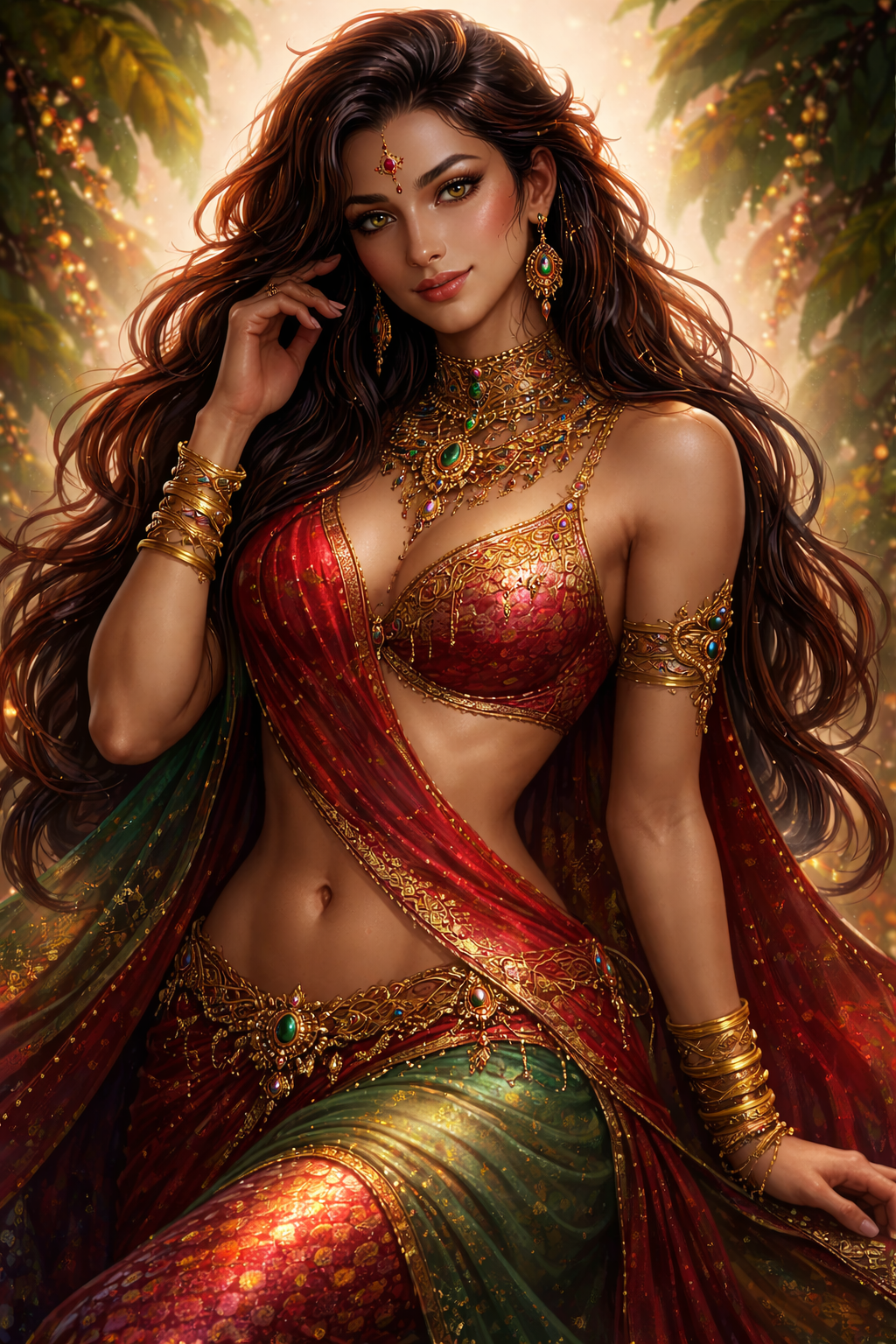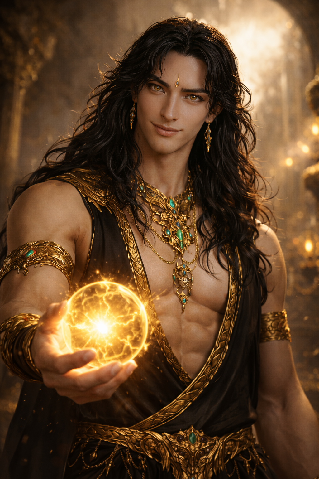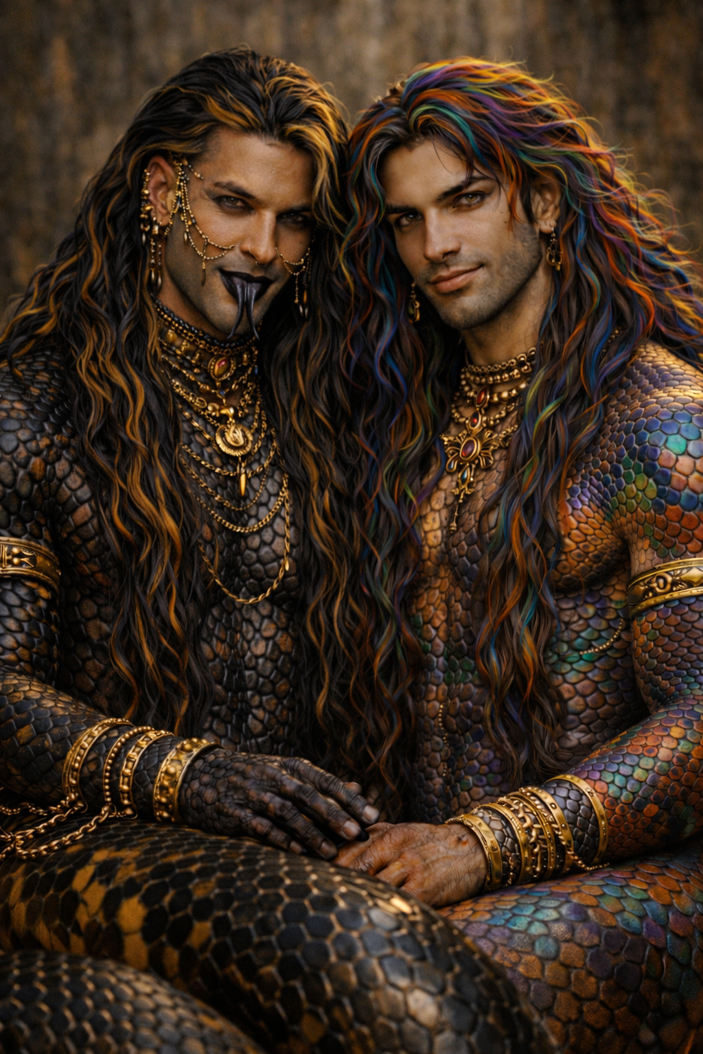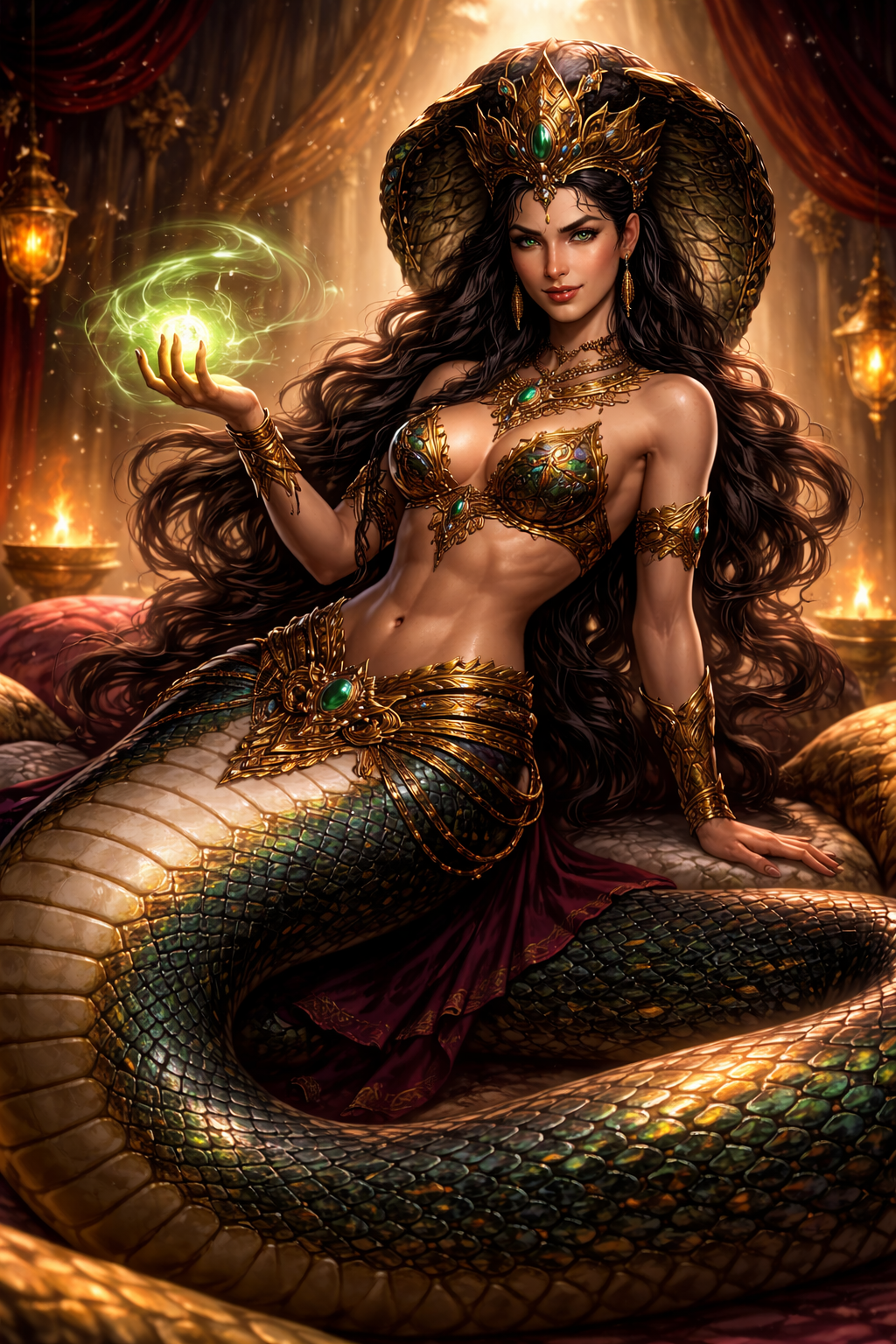 Змеевидное тело скользнуло по мрамору так тихо, что звук был не слышен, но ощутим — как шелест травы перед броском. Чешуя королевской кобры поблескивала оливковым и черным, рисунок капюшона то наплывал на его спину, то исчезал, как настроение. Верхняя половина тела — гибкая, нагло-красивая. Волосы густые, темные, с зеленоватым отливом, украшены золотой нитью. На руках — браслеты, на ухе — рубин, на шее — цепочки. Как всегда, немного «слишком», и он гордится этим.