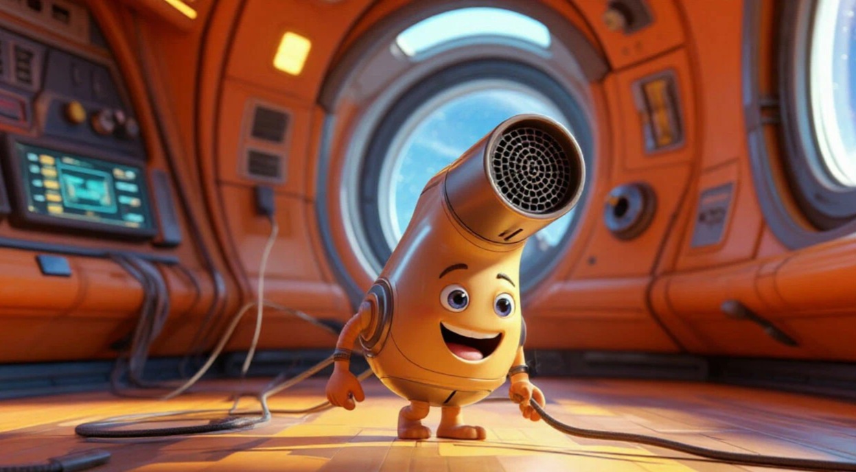 На полу, на лапках стоял фен и радостно скалился.