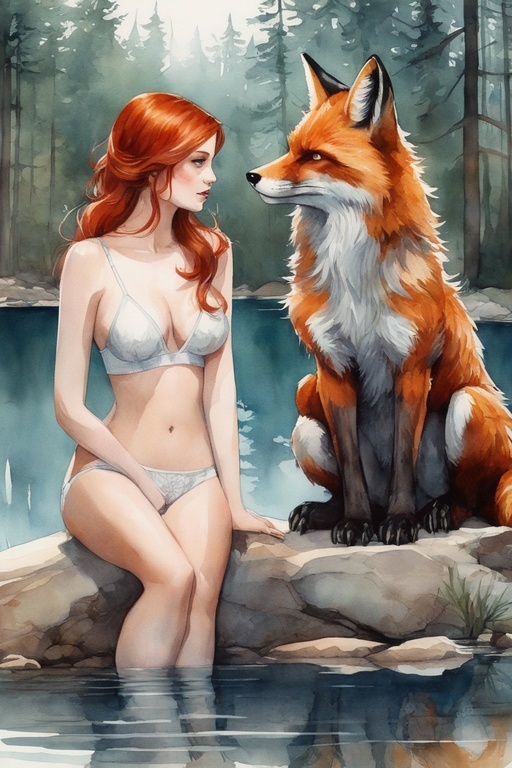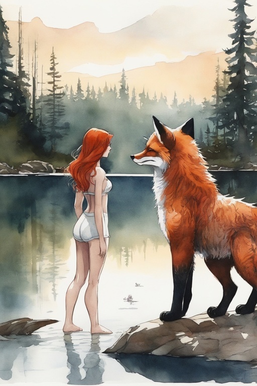 Вокруг озера был дремучий лес. Казалось, в него даже лучи солнца не проникают. Заманчивая тьма, и я поплыла к другому берегу. Приблизившись, я увидела меж ветвей глаза. Сначала подумала, что показалось. Пару раз моргнув, осознала, что это все же зверь. Подплыв ближе увидела лиса... Огромного лиса. Его глаза будто горели желтым. Он смотрел на меня не отрываясь. Любопытство пересилило и я вылезла на берег. Зверь тоже стал пробираться сквозь ветви. Его морда была на уровне моей груди. Я испуганно отпрянула.