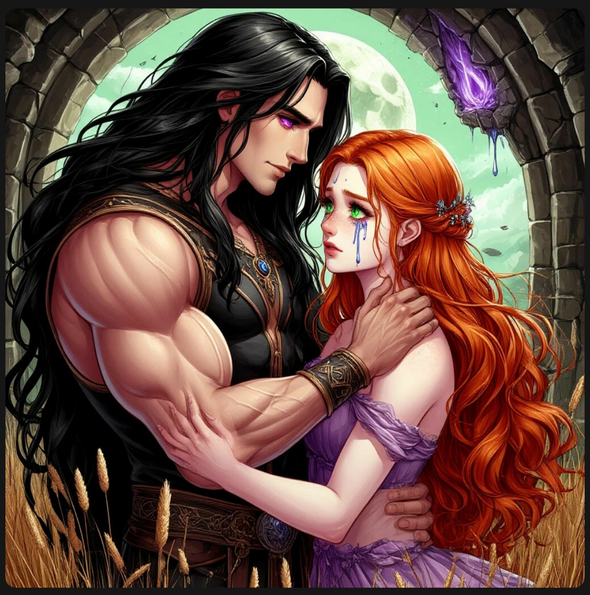 Варя сидела на сухой траве, обхватив колени руками. Её плечи содрогались от беззвучных рыданий, а по щекам текли слёзы, оставляя мокрые дорожки на грязных щеках. Кощей, заметив девушку, медленно приблизился, чувствуя, как что-то незнакомое шевельнулось в его сердце. Когда он поднял голову, его аметистовые глаза в изумлении расширились.