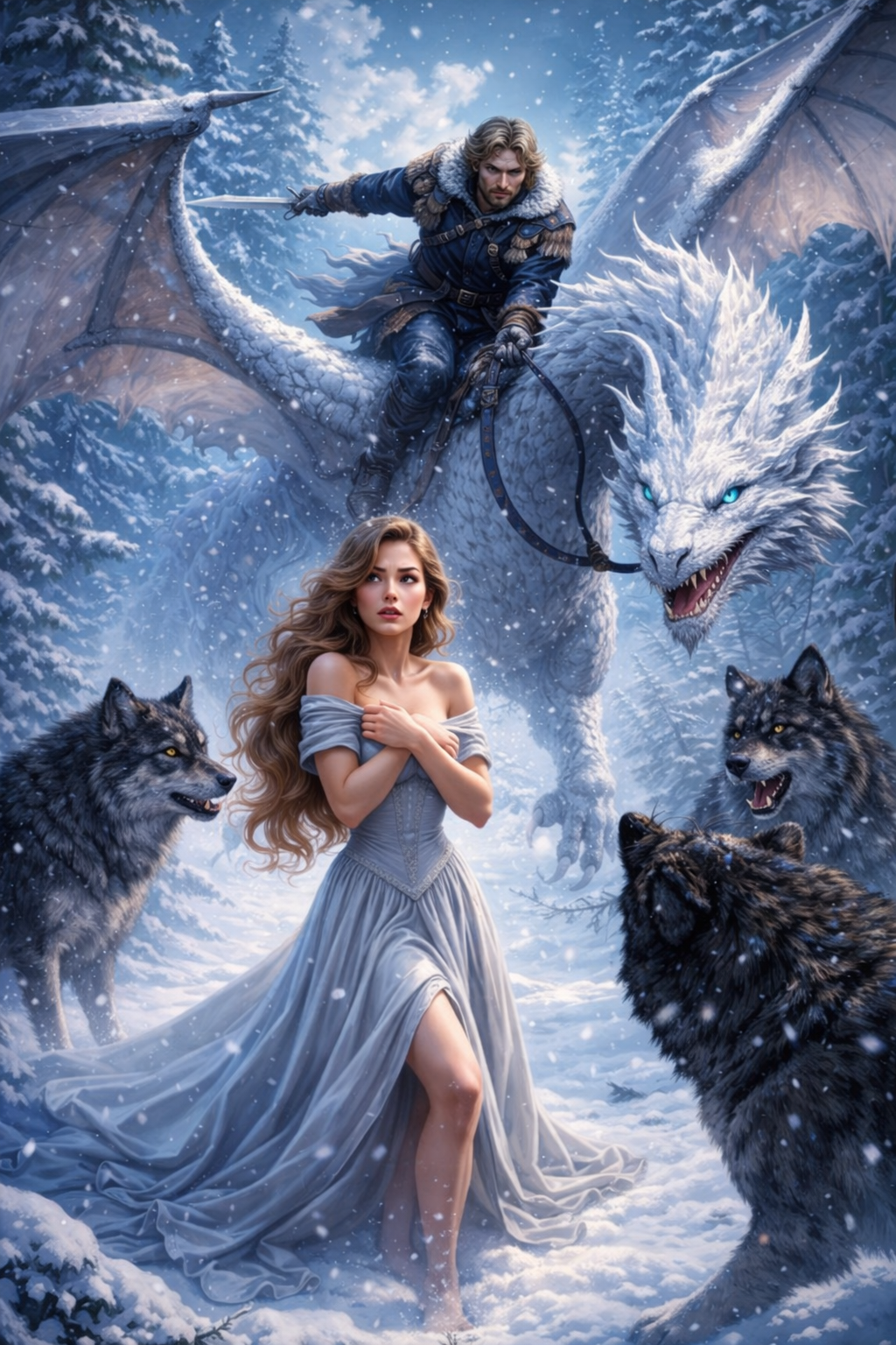 Но удивило меня не это. С неба на нас надвигалось что-то большое, хлопая крыльями и поднимая снежные вихри. Ветер стих, волки сбежали, зато появился высокий, статный мужчина. Его темные волосы были завязаны в хвост, массивное пальто с меховой оторочкой скрывало явно спортивные формы. Я засмотрелась на то, как мужественно он спрыгнул с дракона, на котором прилетел! Таких я не видела ни мужчин, ни драконов. Точнее, не помнила, чтобы когда-нибудь видела белых драконов, покрытых жесткой чешуей, оседланных массивным седлом, которое сплошь забито разными видами оружия. А мужчина выглядел сурово и мужественно. Прямо летающая артиллерия.