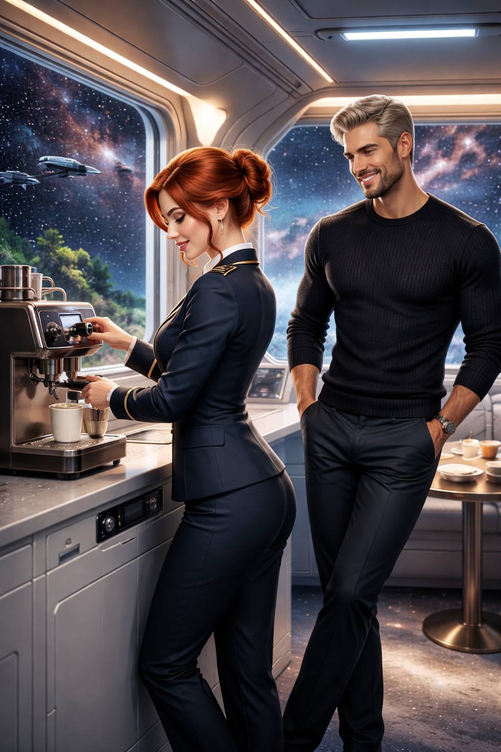 Я стояла в служебном отсеке, одной рукой придерживая поднос с чашками, а другой пыталась заставить старую кофемашину не плеваться паром в лицо. За иллюминатором медленно текла черная бесконечность, прошитая тонкими линиями света — маршрутами, по одному из которых последует наш поезд. Вся станция, с которой мы отбываем, была закрыта бронированным стеклом, дабы люди и не-совсем-люди могли безопасно любоваться открытым космосом, ожидая свою очередь. Красиво. Мирно. Почти романтично.