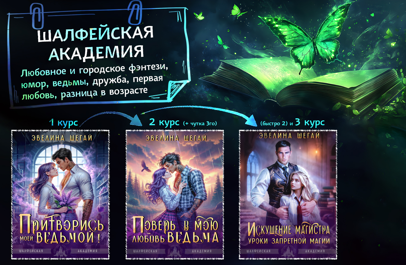 Самый свежий цикл, в рамках которого будет написано минимум четыре книги. Все лёгкие, позитивные, с локальными интригами внутри студенческого общества. Между собой истории будут связанны общими персонажами. Открывает цикл дилогия, первая часть которой прямо сейчас в процессе написания: «Притворись моей ведьмой»