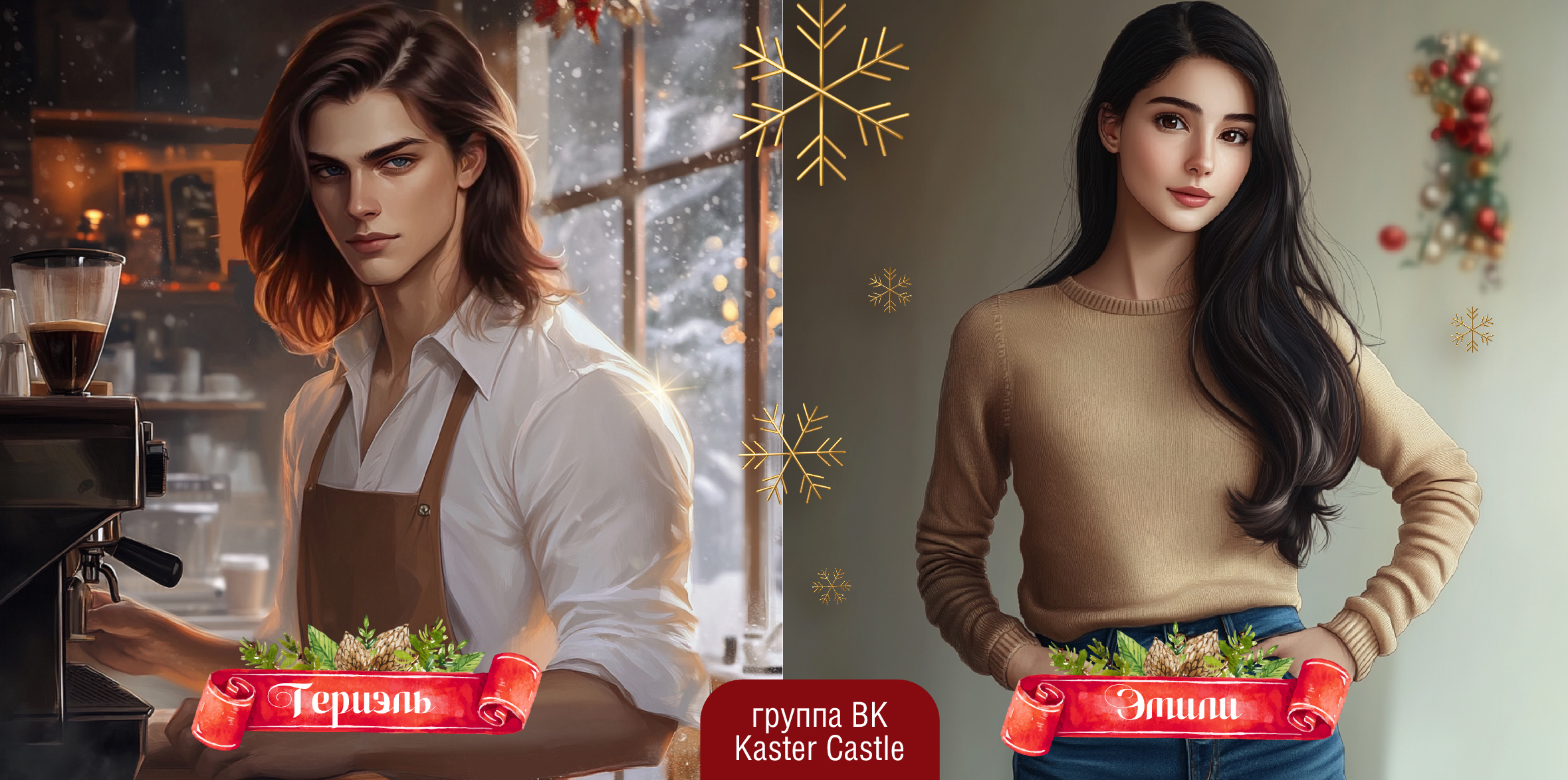 В просторной, но очень уютной кофейне где-то посреди нигде кипели последние приготовления. Девушка, взобравшись на стремянку, украшала большую пышную елку и подпевала мелодии, льющейся из колонок под потолком. Иголки то и дело кололи ей пальцы, но она продолжала ловко навешивать красные и золотые блестящие шары на ветви.
