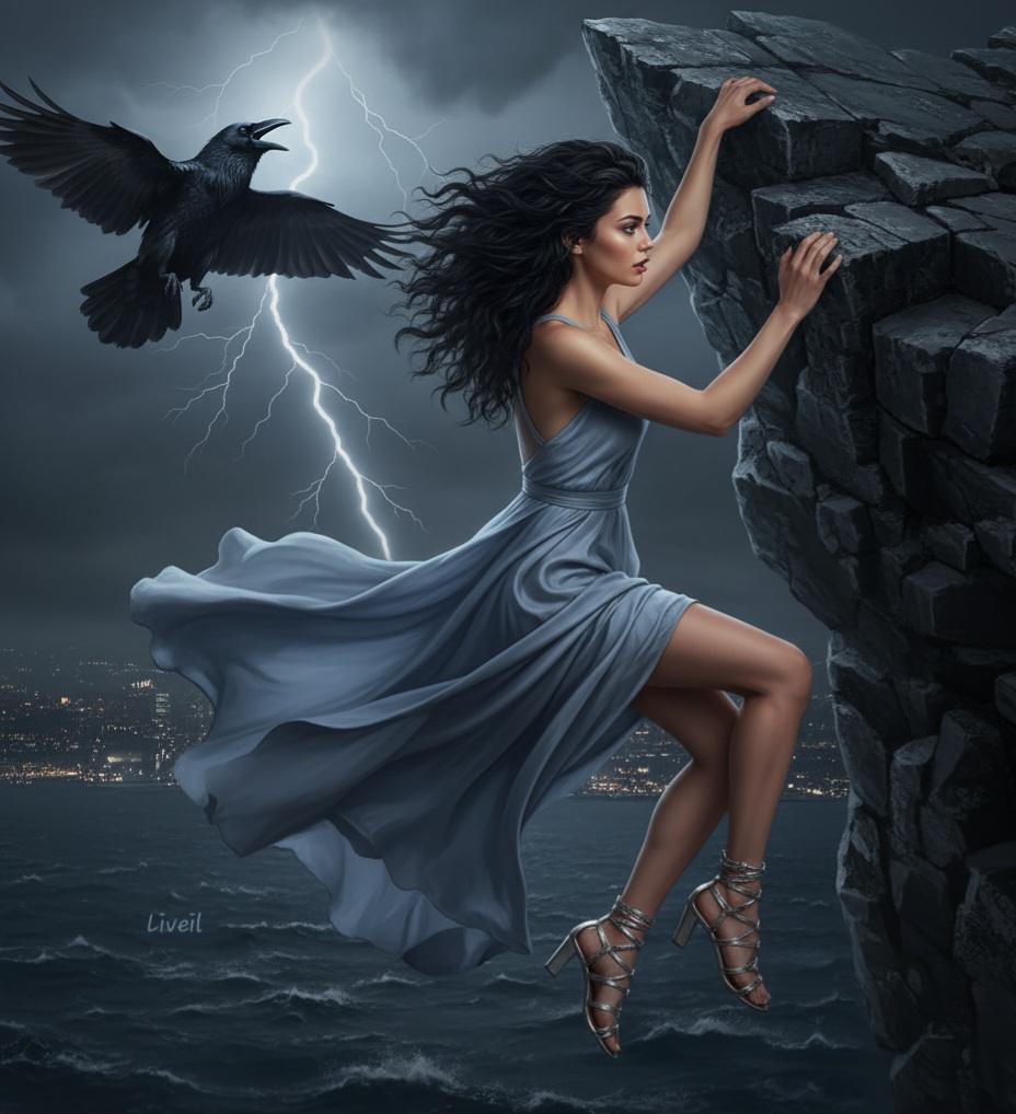 Вдруг порыв ветра усилился, и Эмили почувствовала, что теряет равновесие. Она сделала шаг назад, но отступилась и повисла над пропастью, держась лишь за кончики пальцев. Сердце её бешено колотилось, дыхание перехватило ужас.