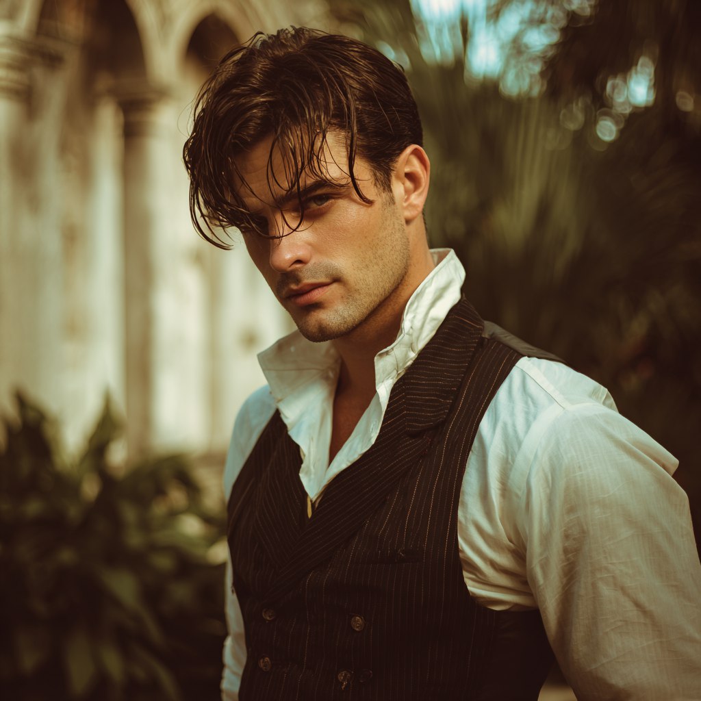 У мраморной колонны, скрытая в тени утреннего солнца, стояла высокая мужская фигура в безупречном костюме. Его глаза прикрывали поля лёгкой фетровой шляпы, а руки в белоснежных перчатках держали трость.