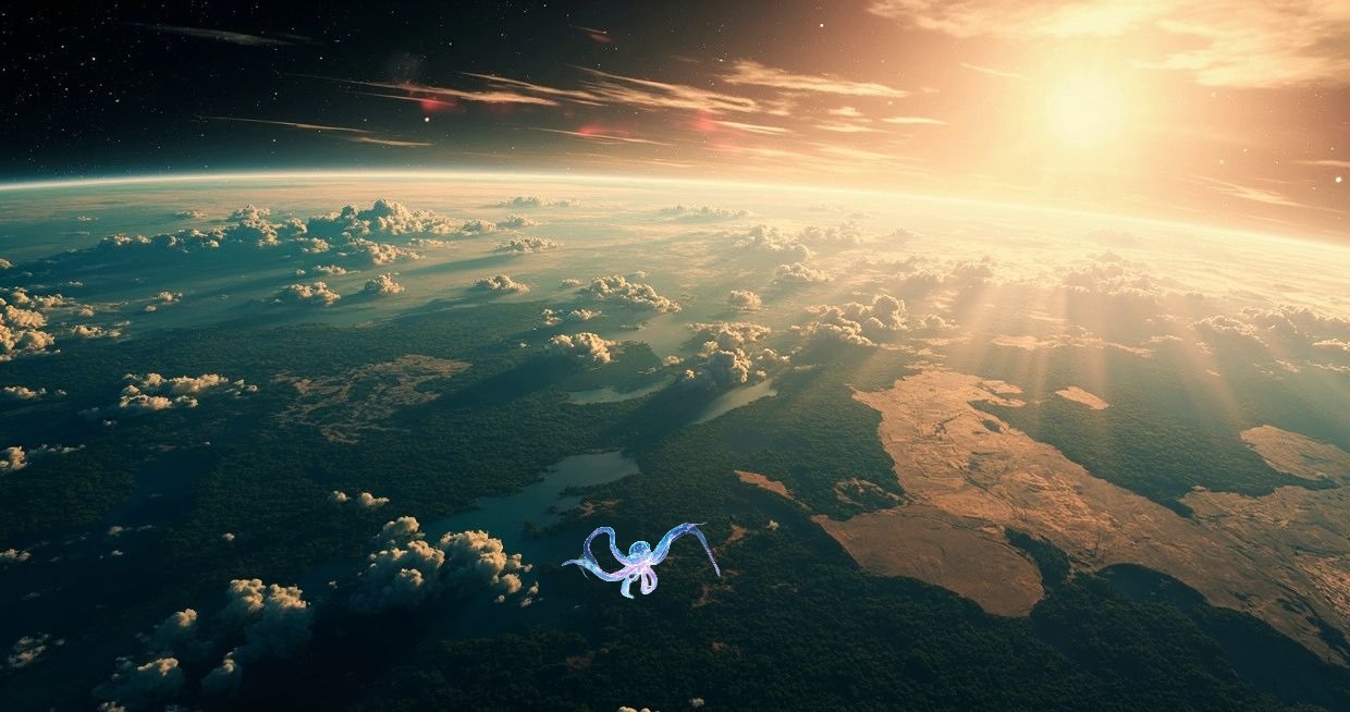 Постаравшись зафиксировать направление полета корабля, я обернулась. Земля отсюда казалась зелено-коричневой, с голубыми прожилками, вогнутой чашей, а на ее фоне трепыхалась какая-то полупрозрачная голубоватая клякса.